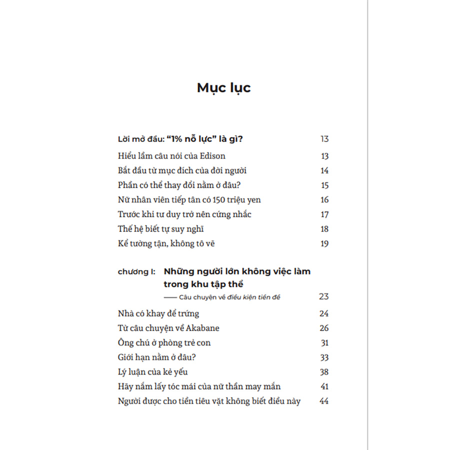 Nhiều người luôn chọn con đường cố gắng để đạt được ước mơ của mình. Nhưng trên đời này, không phải lúc nào ta cũng có thể thành công khi cố gắng hết mi. Bên cạnh đó, cũng có những lúc bạn đã rất nỗ lực nhưng vẫn thất bại. Nhà phát minh Edison có câu nói nổi tiếng : “Thiên tài chỉ có 1% cảm hứng, còn 99% là mồ hôi (Genius is one percent inspiration and 99 percent perspiration)”. Tuy nhiên, câu nói này còn có hàm ý khác là nếu không có 1% cảm hứng thì có 99% mồ hôi, tức là nỗ lực, cũng thành vô dụng. Trong nhiều lĩnh vực, xuất phát điểm chính là ý tưởng hay nguồn cảm hứng, nếu không có 1% ban đầu thì có nỗ lực cũng vô nghĩa. Chỉ cần tìm được và thay đổi 1% ấy thì cuộc đời bạn sẽ muôn phần dễ dàng hơn.