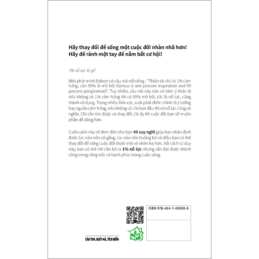 Cuốn sách này sẽ giúp bạn thay đổi "tư duy của tư duy" dựa trên 49 suy nghĩ, được chia thành bảy chủ đề chính bao gồm: quan điểm, thứ tự ưu tiên, nhu cầu và giá trị, vị trí, nỗ lực, kiểu mẫu hóa, và phần đời về sau. Những suy nghĩ này sẽ giúp bạn nhận định được lúc nào nên cố gắng, lúc nào nên buông bỏ và điều bạn có thể thay đổi để sống cuộc đời thoải mái và nhàn hạ hơn. Với cách tư duy này, bạn có thể chỉ cần bỏ ra 1% nỗ lực nhưng vẫn đạt được thành công trong công việc và hạnh phúc trong cuộc sống.