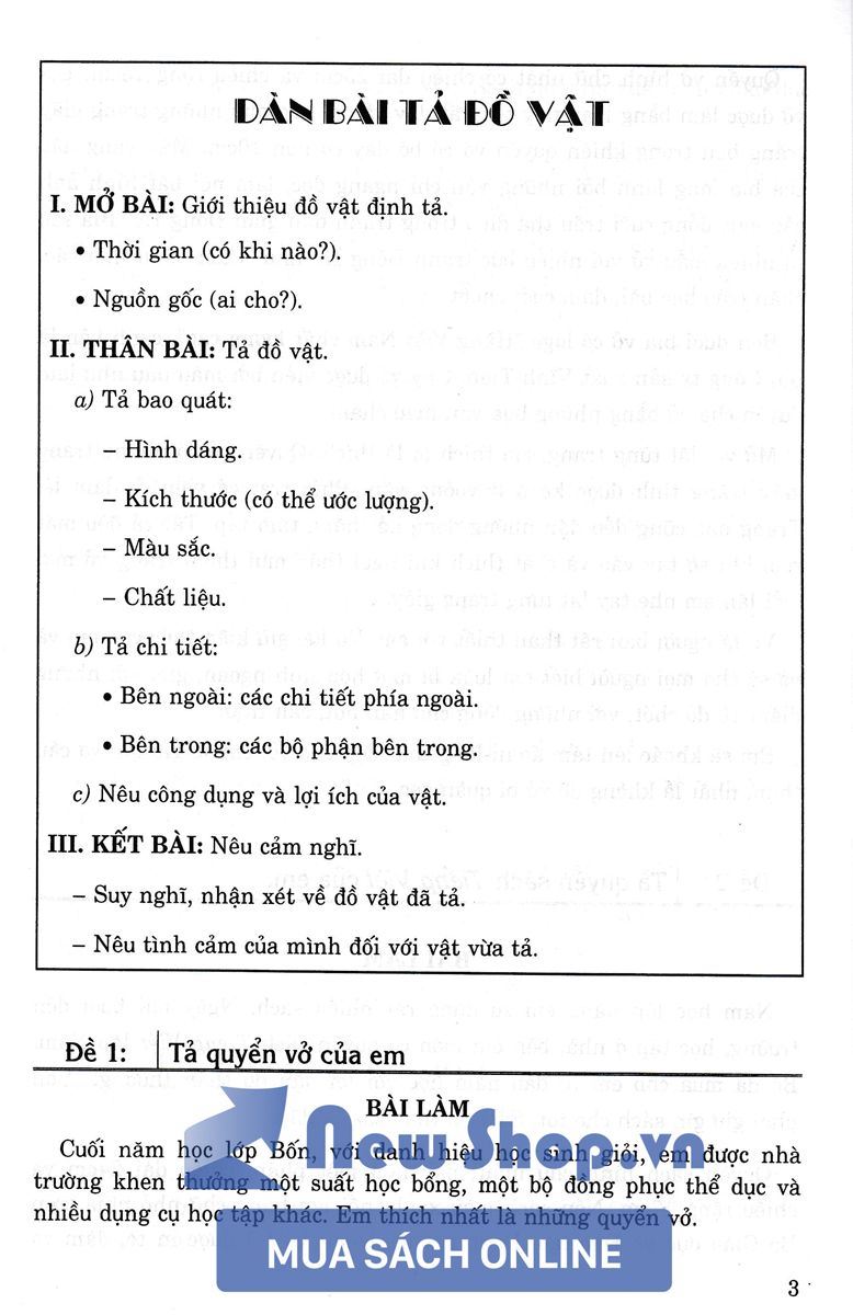 Cuốn sách bao gồm 100 bài văn mẫu để các em học sinh tham khảo, nhằm giúp các em ôn luyện và rèn luyện kỹ năng tập làm văn đã học trên lớp một cách hiệu quả. Sách còn đưa ra những câu gợi ý, hướng dẫn, tham khảo tùy từng dạng bài tập.