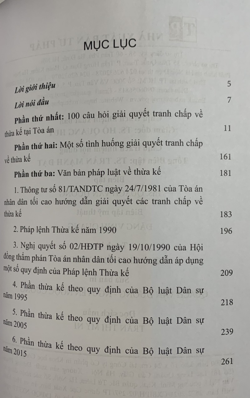 Việc tập hợp, chỉnh lý 100 câu hỏi này góp phần nâng cao kiến thức, | kinh nghiệm cho những người tham gia vào việc giải quyết các vụ việc dân sự tại Tòa án và nhằm tuyên truyền, phổ biến pháp luật giải quyết tranh chấp về thừa kế tới bạn đọc. - Ngoài ra, cuốn sách còn có một số tình huống giải quyết tranh
