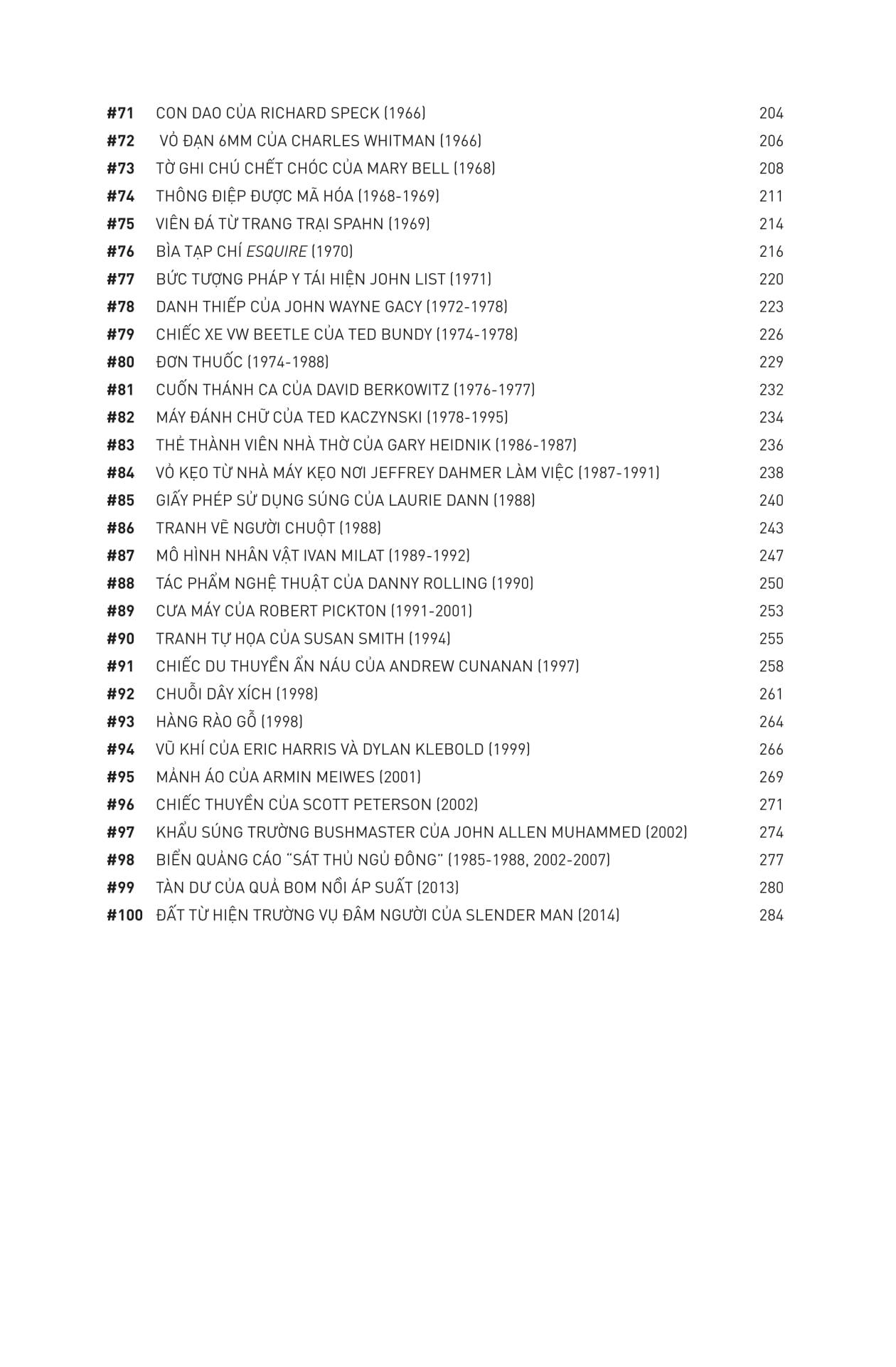 Trong 100 kỷ vật tội ác, tác giả kỳ cựu về tội ác có thật Harold Schechter sẽ giới thiệu đến bạn đọc 100 hiện vật liên quan đến sát nhân trong suốt 2 thế kỷ (1808 - 2014) thông qua những câu chuyện đầy lôi cuốn. Như một hành trình văn học đan xen với hình ảnh, cuốn sách trình bày một dòng lịch sử độc nhất vô nhị trong thể loại tội ác có thật, đảm bảo sẽ kích thích niềm đam mê của những người hâm mộ thể loại tội ác có thật, đồng thời phô bày một bức tranh toàn cảnh về lý do tại sao chúng ta cứ liên tục bị cuốn hút vào những kẻ thủ ác gây giật gân cực độ.