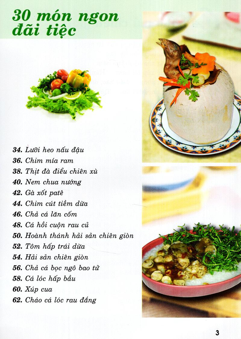 Cuốn sách giới thiệu đến bạn đọc 30 công thức chế biến món ngon đãi tiệc: cá bống mú chiên giòn, khoai tây nhồi thịt bò, chả giò hải sản, gà hấp nhụy sen, chả cá ba sa bọc xúc xích, đậu hũ non chiên xù, sứa tươi trộn hỗn hợp, cánh gà nấu nấm hương, sò dương trộn chua ngọt, cá ba sa nướng sả, sò nhồi, nghêu chiên giòn,...