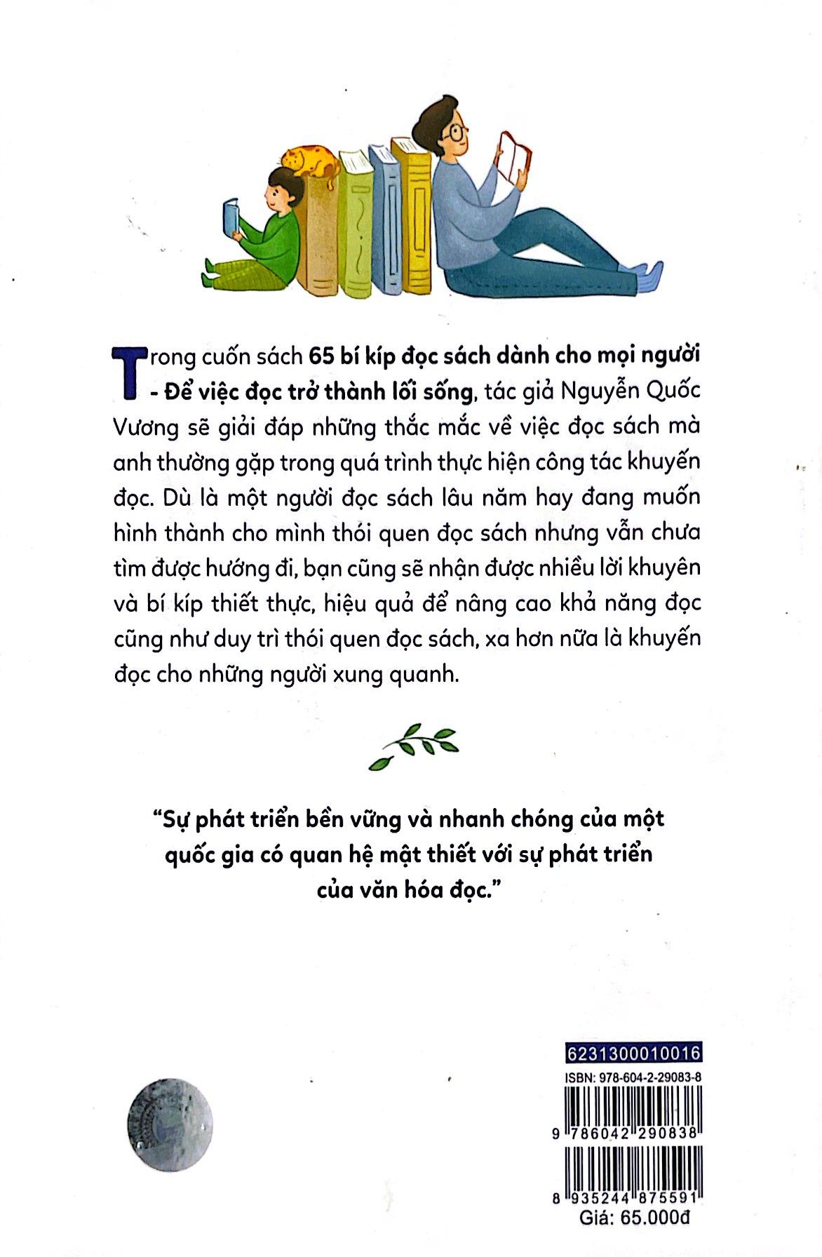 Từ những câu hỏi nhận được từ hàng trăm cuộc nói chuyện, diễn thuyết trong quá trình thực hiện công tác khuyến đọc, nhà nghiên cứu Nguyễn Quốc Vương đã tổng hợp và giải đáp những thắc mắc về việc đọc sách trong 65 Bí Kíp Đọc Sách Dành Cho Mọi Người.