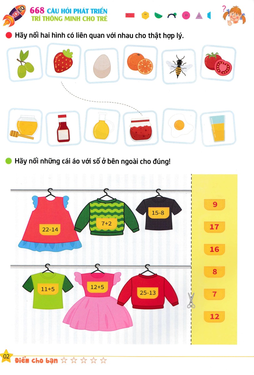 Bộ sách 668 Câu Hỏi Phát Triển Trí Thông Minh Cho Trẻ giúp phát triển IQ, EQ thông qua những trò chơi toán học logic, phát huy tối đa khả năng nhận thức, tư duy phân kỳ, trí tưởng tượng, tri giác về không gian, phán đoán suy luận một cách khoa học về những sự vật, sự việc trong tự nhiên. Bộ sách sẽ là nhũng bài học đầy thú vị để bố mẹ và con cái có sự tương tác với nhau. Đồng thời nâng cao năng lực tư duy, tính chính xác và rèn luyện độ kiên trì cho trẻ.