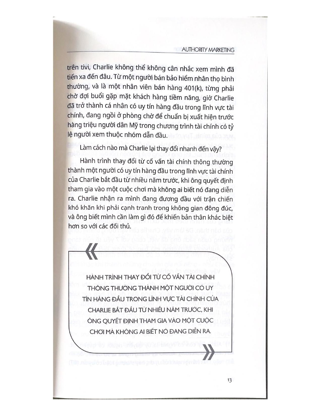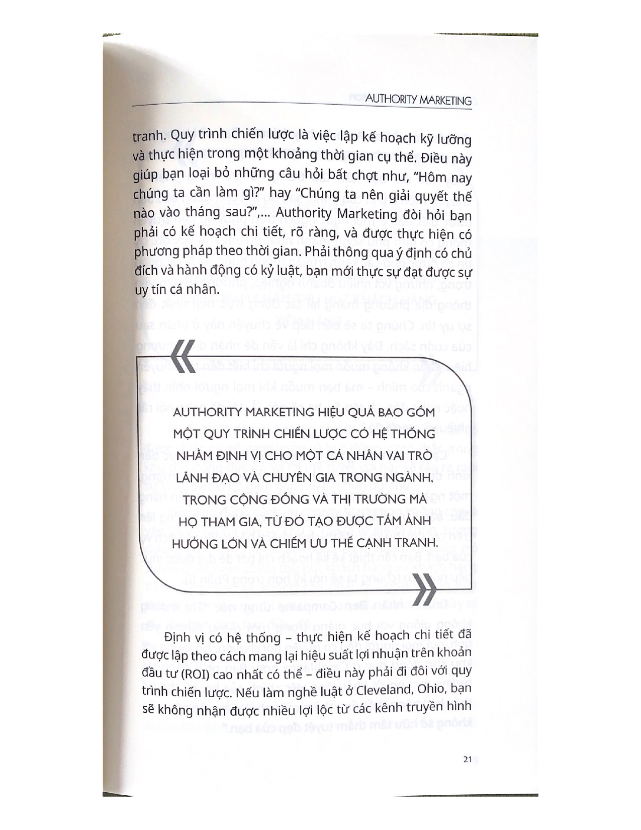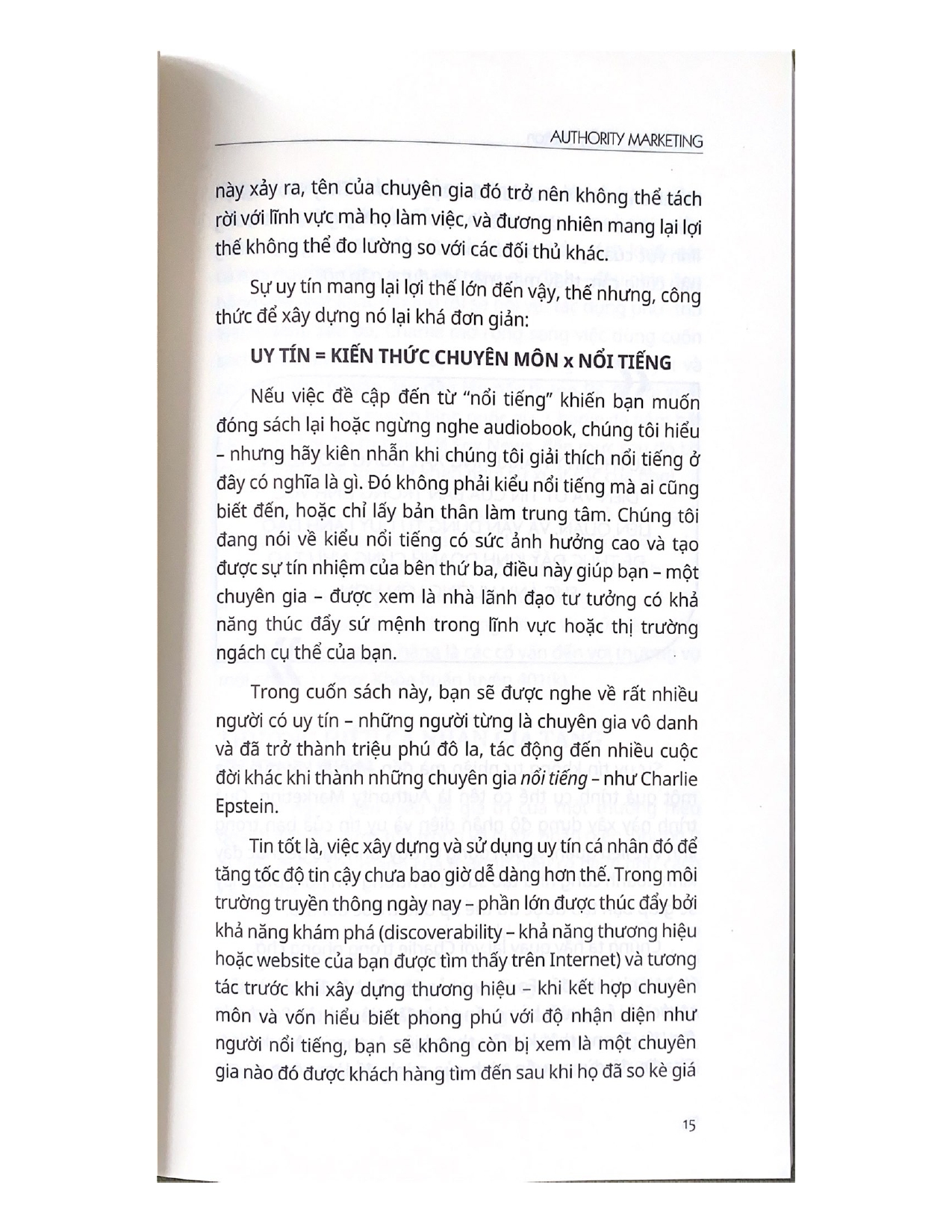 Nếu bạn là một chuyên gia, doanh nhân hoặc giám đốc điều hành đang cảm thấy thất vọng với cách marketing truyền thống, nếu bạn muốn phát triển doanh nghiệp và tạo được tác động lớn hơn, cuốn sách này sẽ chỉ cho bạn cách dùng Authority Marketing để tạo lập kế hoạch rõ ràng và có thể theo dõi, nhằm thay đổi từ một chuyên gia bị xem như hàng hóa thành người có uy tín xuất hiện khắp nơi.