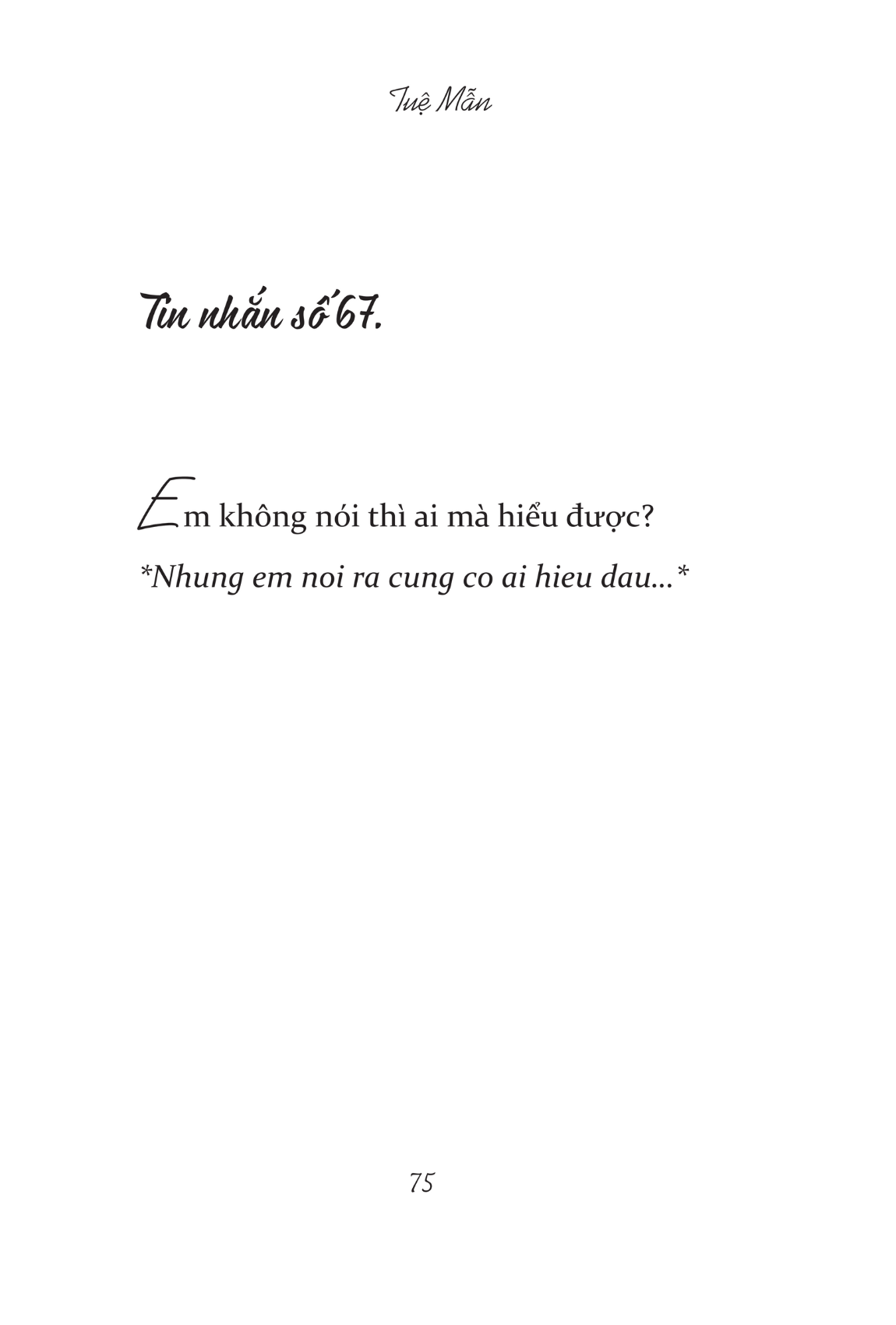 GIỚI THIỆU TÁC GIẢ Tuệ Mẫn – một nhà văn được nhiều bạn trẻ yêu thích nhờ lối viết giản dị, nhẹ nhàng và rất đỗi cảm xúc. Bắt đầu cầm bút từ những ngày đầu của tuổi đôi mươi, Tuệ Mẫn bén duyên với nghề viết với cuốn sách đầu tay “Anh đã quên em chưa?”. Những câu chuyện của Tuệ Mẫn như cái ôm vỗ về dịu dàng đến những trái tim biết yêu ngoài kia, để gửi đi hi vọng sau này ai cũng sẽ có được hạnh phúc xứng đáng.