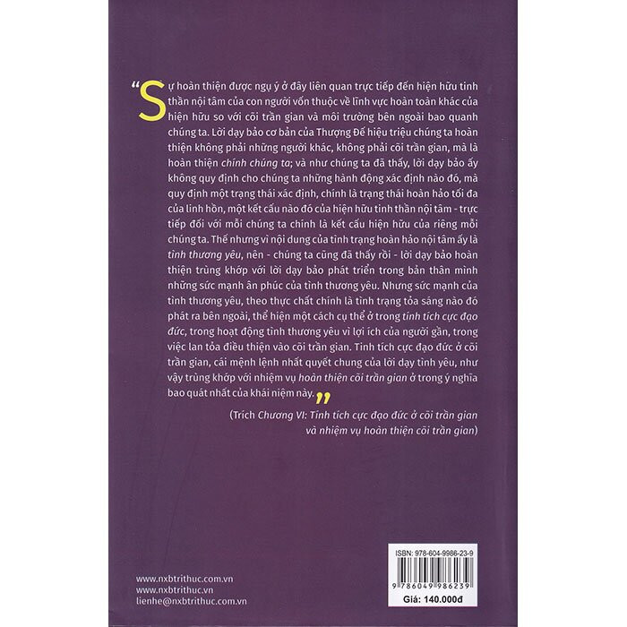 “Sự hoàn thiện được ngụ ý ở đây liên quan trực tiếp đến hiện hữu tinh thần nội tâm của con người vốn thuộc về lĩnh vực hoàn toàn khác của hiện hữu so với cõi trần gian và môi trường bên ngoài bao quanh chúng ta. Lời dạy bảo cơ bản của Thượng Đế hiệu triệu chúng ta hoàn thiện không phải những người khác, không phải cõi trần gian, mà là hoàn thiện chính chúng ta; và như chúng ta đã thấy, lời dạy bảo ấy không quy định cho chúng ta những hành động xác định nào đó, mà quy định một trạng thái xác định, chính là trạng thái hoàn hảo tối đa của linh hồn, một kết cấu nào đó của hiện hữu tinh thần nội tâm - trực tiếp đối với mỗi chúng ta chính là kết cấu hiện hữu của riêng mỗi chúng ta. Thế nhưng vì nội dung của tình trạng hoàn hảo nội tâm ấy là tình thương yêu, nên - chúng ta cũng đã thấy rồi - lời dạy bảo hoàn thiện trùng khớp với lời dạy bảo phát triển trong bản thân mình những sức mạnh ân phúc của tình thương yêu. Nhưng sức mạnh của tình thương yêu, theo thực chất chính là tình trạng tỏa sáng nào đó phát ra bên ngoài, thể hiện một cách cụ thể ở trong tính tích cực đạo đức, trong hoạt động tình thương yêu vì lợi ích của người gần, trong việc lan tỏa điều thiện vào cõi trần gian. Tinh thần tích cực đạo đức ở cõi trần gian, cái mệnh lệnh nhất quyết chung của lời dạy tình yêu, như vậy trùng khớp với nhiệm vụ hoàn thiện cõi trần gian ở trong ý nghĩa bao quát nhất của khái niệm này”….