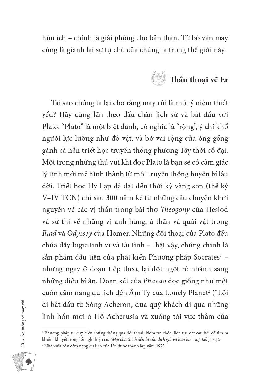 “Ảo tưởng về may rủi” sẽ đưa bạn vào hành trình khám phá một trong những khái niệm lâu đời nhất của văn hóa: vận may. Cuốn sách xem xét cách các hiền nhân hiểu về may rủi, trước khi bước vào thế giới lý thuyết của xác suất và lý giải may rủi có liên quan như thế nào đến thần học, thể thao, đạo đức, cờ bạc, kiến thức và tâm lý học ngày nay. Trong lúc du hành qua các truyền thống, thời đại và nền văn hóa, bạn sẽ nhận ra rằng may rủi không phải là con mãng xà cứ chặt một đầu thì nó mọc lại hai đầu, mà thực ra con quái vật đó hoàn toàn chỉ là ảo tưởng.