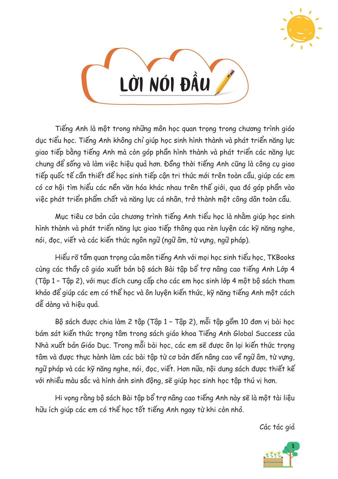 Hiểu được nhu cầu đó, TKBooks cùng các thầy cô đã biên soạn và cho ra đời bộ sách Bài tập bổ trợ nâng cao Tiếng Anh – Lớp 4, được chia làm 2 tập, tương ứng với hai học kỳ.