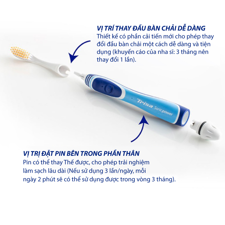 Bài Chải Pin Trisa Complete Protection Bề mặt chải “Complete Protection” được phát triển một cách khoa học giúp loại bỏ các mảng bám hiệu quả cao, bảo vệ răng và nướu toàn diện, kết hợp với các chuyển động âm thanh tần số cao giúp làm sạch hiệu quả hơn 30%. Pin AAA Batterie đi kèm có thể thay thế được cho phép trải nghiệm làm sạch lâu dài (Nếu sử dụng 3 lần/ngày, mỗi ngày 2 phút sẽ có thể sử dụng được trong vòng 3 tháng). Thiết kế có phần cải tiến mới cho phép thay đổi đầu bàn chải một cách dễ dàng và tiện dụng (khuyến cáo của nha sĩ: 3 tháng nên thay đổi 1 lần). Chống nước tối đa, giúp bạn bảo quản sản phẩm lâu dài hơn Hướng Dẫn Sử Dụng: