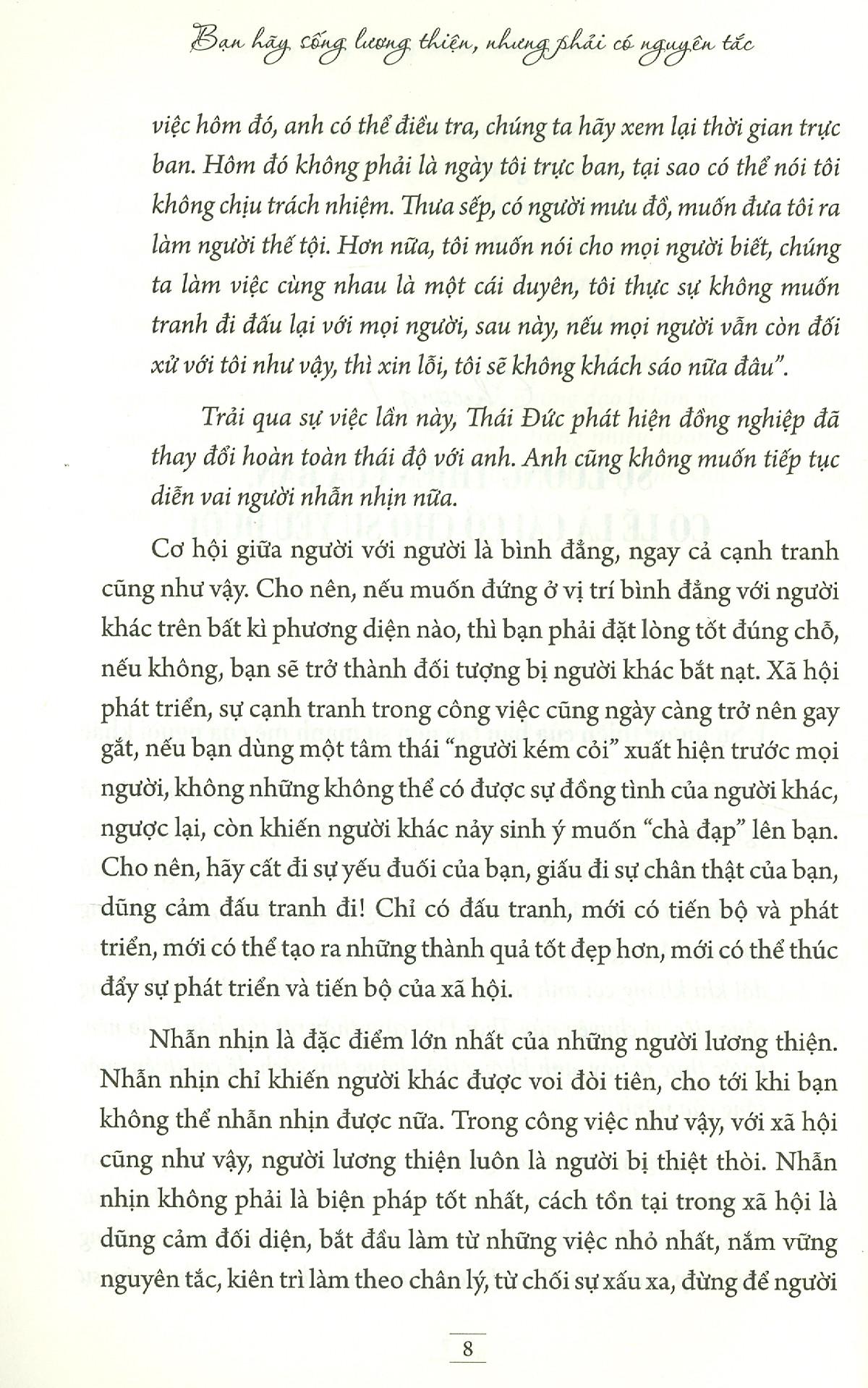 Bạn Hãy Sống Lương Thiện, Nhưng Phải Có Nguyên Tắc Trong xã hội hiện đại biến đổi khôn lường, cạnh tranh khốc liệt, người lương thiện nên làm gì để thay đổi hiện trạng cuộc sống của mình và xây dựng một cuộc đời hạnh phúc đây? Đó chính là sự lương thiện của bạn cần phài có nguyên tắc, cần phải có thái độ hài hòa, linh hoạt, tích cực trong công việc và ứng xử. Bạn lương thiện nhưng vẫn phải mạnh mẽ, học cách bảo vệ bản thân, biết cách giành lấy cơ hội thành công. Người lương thiện chắc chắn có thể tạo nên một cuộc sống xuất sắc, vẫn có được hạnh phúc của riêng mình.