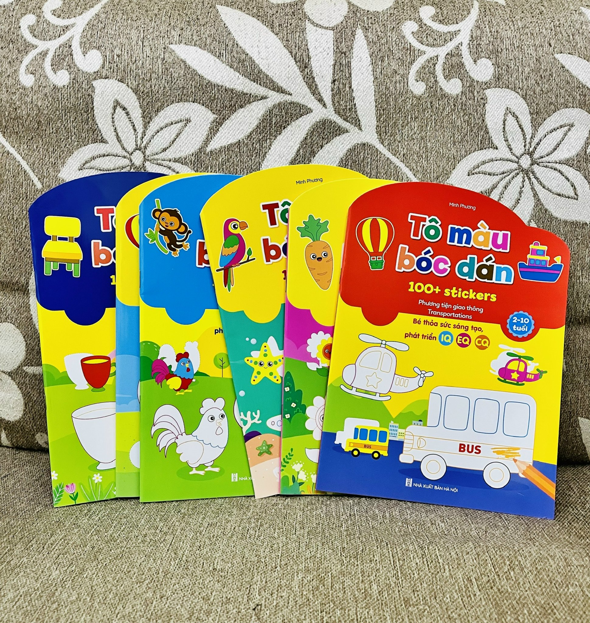 Bộ sách Tô màu bóc dán 100+ stickers (song ngữ Anh – Việt) gồm 6 cuốn với 6 chủ đề khác nhau