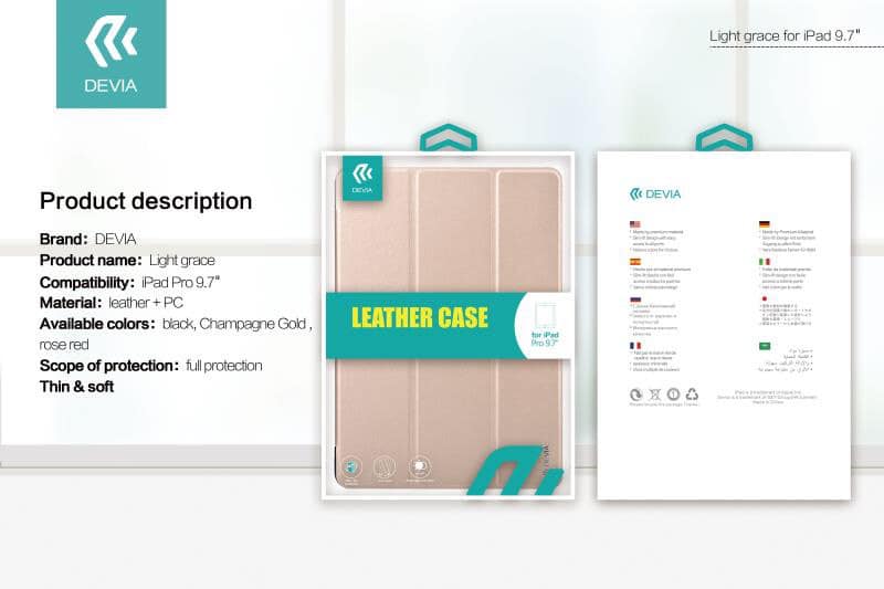 Bao da Devia Light grace dành cho aple ipaad 9.7 inch Chất liệu: PC + PU · Hỗ trợ gấp; · Vỏ sau bằng PC, hiển thị màu thiết bị gốc, chống va chạm, chống