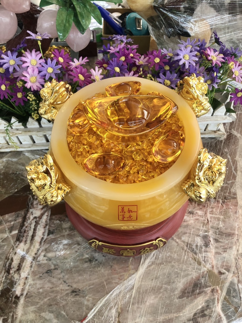 ✨Bát vàng, Bát Tụ Tài, Bát Tụ Bảo đá ngọc cẩm thạch vàng Hút Tài, Hút Lộc, Chiêu tài lộc trang trí bàn thờ ông thần tài thổ địa - Cao 24 cm