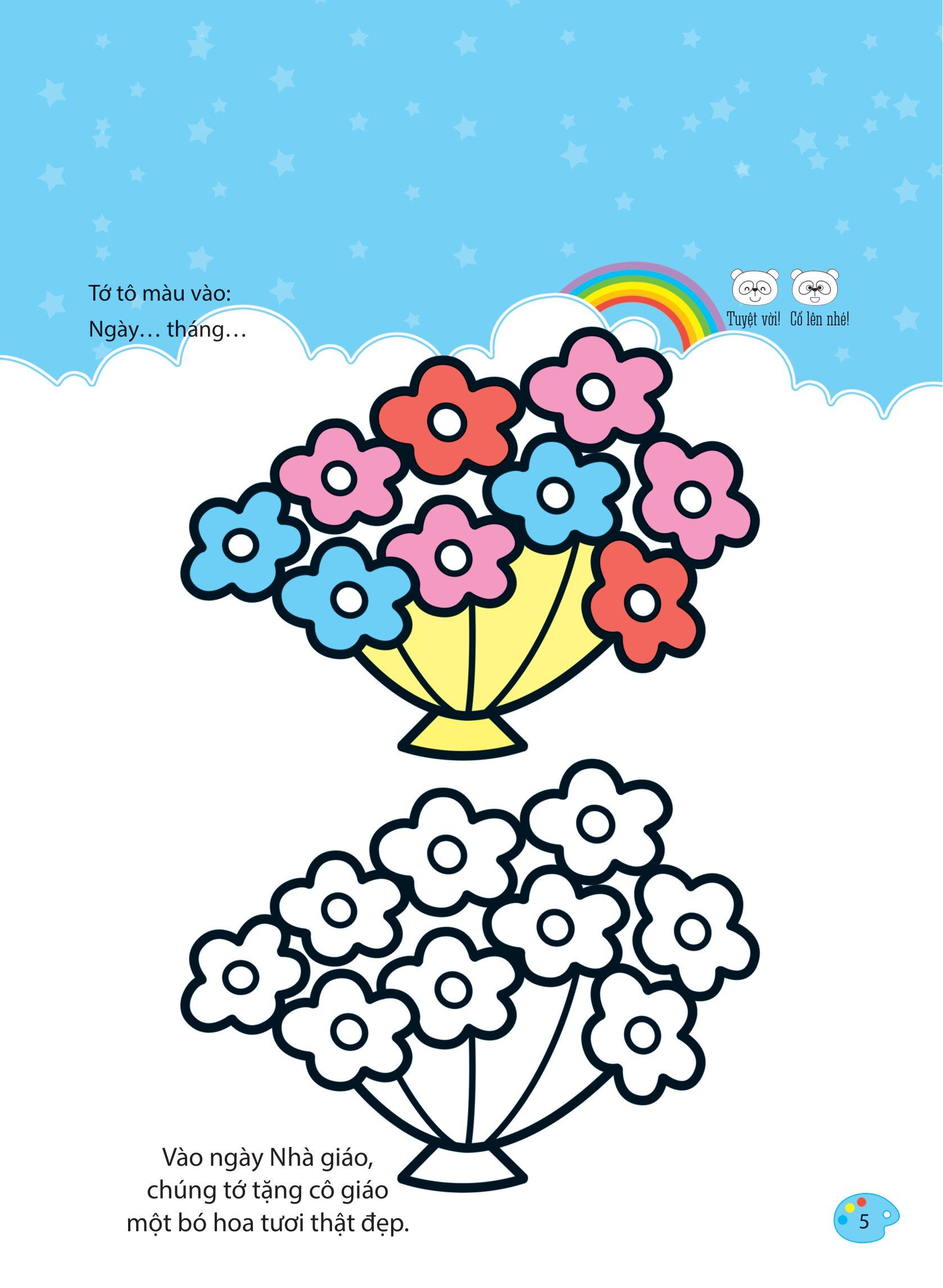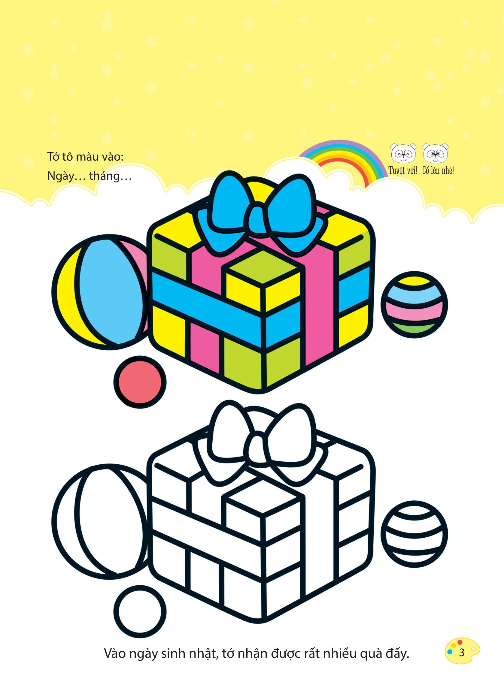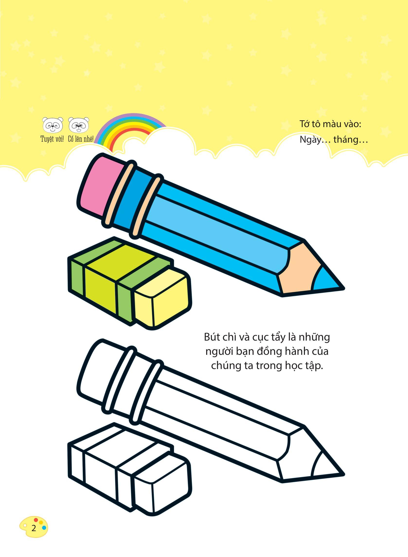 Ngoài việc tô màu theo sự sáng tạo riêng của mỗi bé, sách có gợi ý màu sắc, hình tô mẫu để các bé có thể dễ tưởng tượng và ghi nhớ được hình dạng và màu sắc.