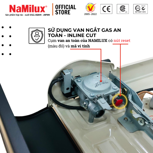ĐẶC ĐIỂM NỔI BẬT ĐỘ AN TOÀN CAO Bếp gas mini NaMilux được trang bị hệ thống van Inline Cut - ngắt gas tự động, được sản xuất trên dây chuyền đạt chuẩn Quốc Tế