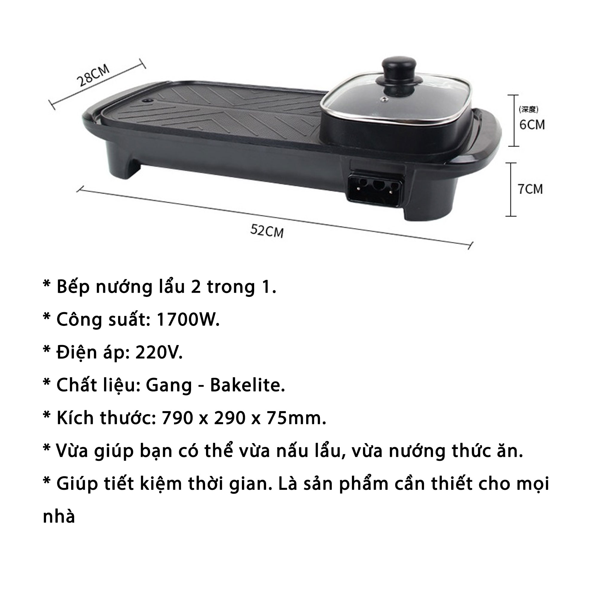Điện thế: 220V/50Hz Công suất: 1000- 1100W nhiệt độ 50 - 240 độ Số ngăn : 2 ngăn ( Lẩu - Nướng) hoạt động độc lập nên khi không dùng nướng bạn hoàn toàn có