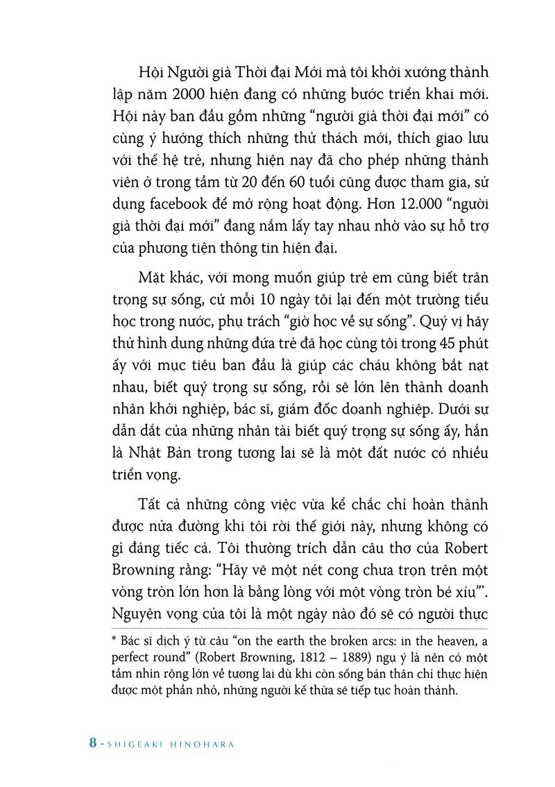 Cố bác sĩ Shigeaki Hinohara sống thọ 106 tuổi và ông vẫn liên tục hành nghề, không nghỉ hưu đến tận ngày 18/7/2016, ngày ông mất. Tựa của quyển sách “Bí quyết trường thọ của người Nhật” có lẽ khiến bạn nghĩ đến việc ông sẽ liệt kê những việc bạn nên làm và không nên làm để có tăng tuổi thọ. Đúng là thế, nhưng quyển sách đặc biệt ở chỗ đó không phải là lý thuyết suông, không phải những lời sáo rỗng mà bạn đôi khi đọc được đâu đó trên mạng, mà đây là những lời khuyên đã được viết bởi một vị bác sĩ già khi bước qua tuổi 90, người đã trải qua những dấu mốc mang tính lịch sử của Nhật Bản và Thế Giới, từng chứng kiến hơn 4000 bệnh nhân giã từ cuộc sống. Đó là tinh hoa từ những kinh nghiệm quý báu khi ông chữa trị cho bệnh nhân, khi ông lắng nghe họ và cả từ những sai lầm mà ông đã phạm phải bởi sự hiếu thắng khi còn trẻ của mình.