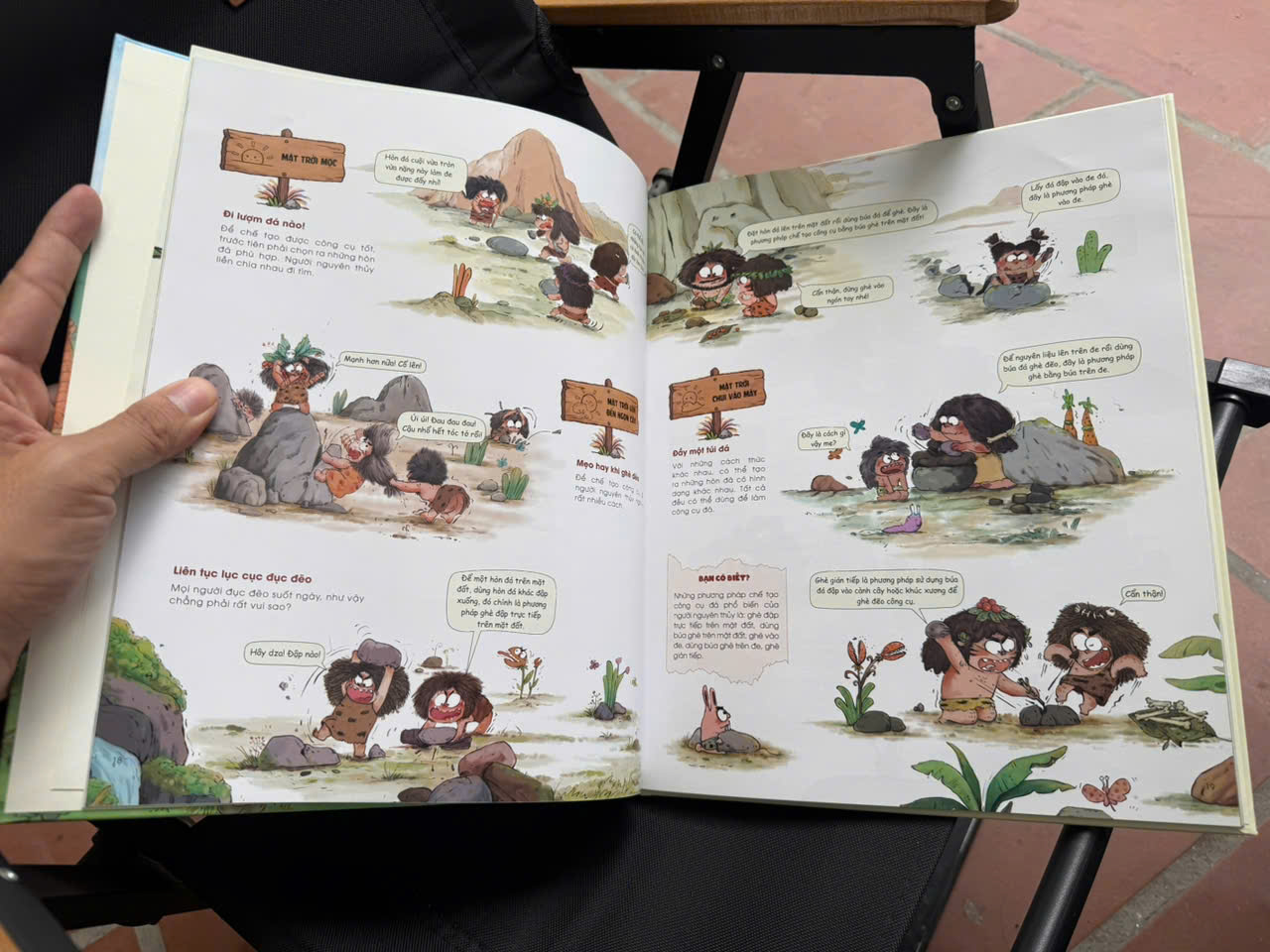 Cuốn sách “Một ngày của người nguyên thủy: Lục cục đục đẽo” sẽ kể cho các bạn nghe về quá trình người nguyên thủy học cách chế ngự ngọn lửa, sử dụng các loại công cụ để việc săn bắt và trồng trọt trở nên dễ dàng hơn, học cách kết hợp các loại vật liệu khác nhau trong cùng một công cụ. Nhờ việc học hỏi này, quá trình khai thác thiên nhiên, mở rộng không gian sinh tồn của loài người chúng ta đã trở nên dễ dàng hơn nhiều.