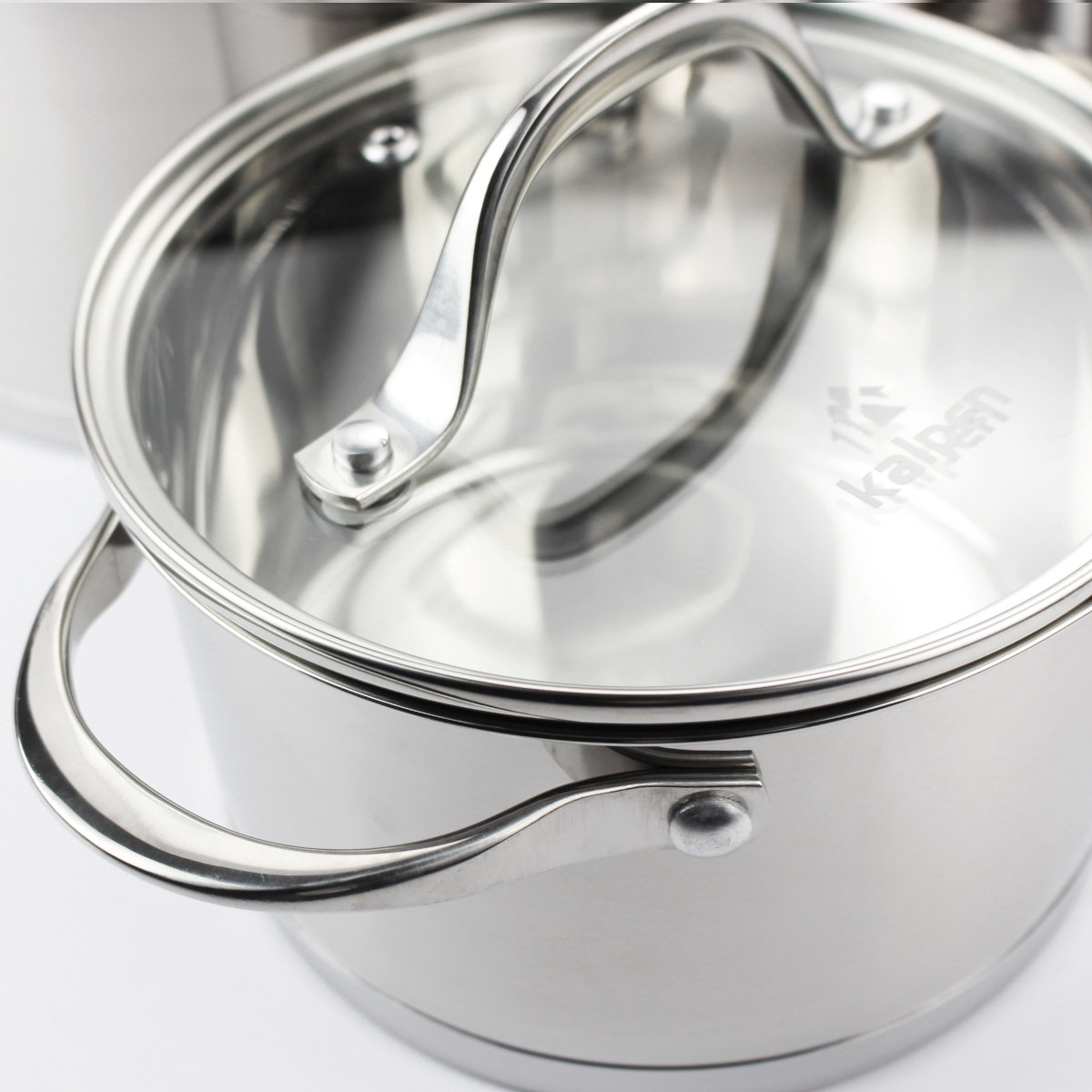 Bộ 3 nồi Inox 304 cao cấp 5 đáy Kalpen Slamer size 16,20,24cm chuẩn hàng Đức Mã sản phẩm: SM1 Thương hiệu: Kalpen xuất xứ Đức Dòng sản phẩm: Slamer Chất liệu: vung kính cường lực dầy 4mm viền inox, chất liệu inox 304, dày 0.6mm. Cấu tạo 5 lớp đáy Màu sắc: Silver Sử dụng được trên tất cả các loại bếp từ, bếp ga, bếp hồng ngoại Bộ nồi inox kalpen gồm 3 chiếc