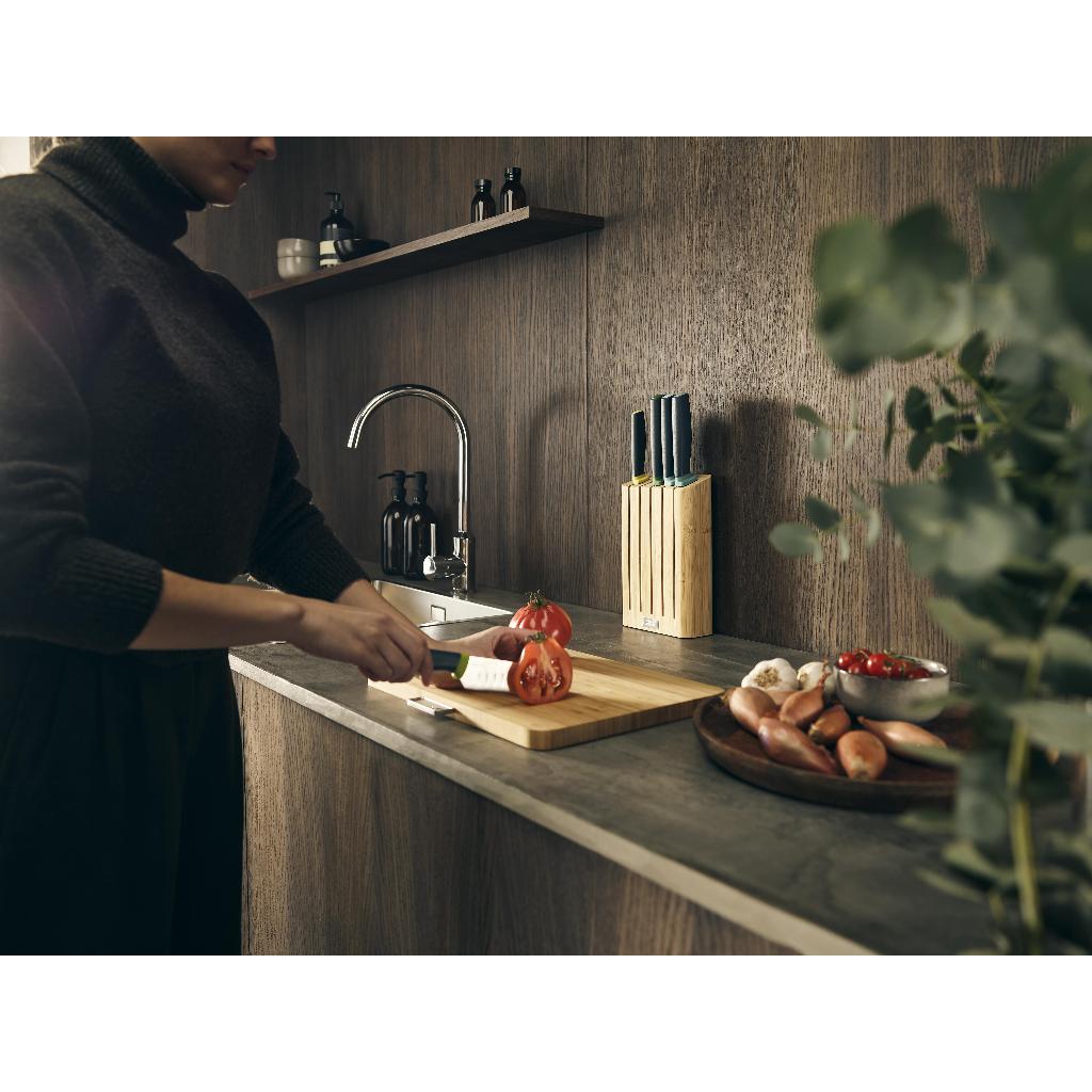 Bộ sản phẩm này bao gồm 5 con dao nhà bếp cần thiết cùng một khối tre mỏng để cất giữ, tiết kiệm diện tích trên mặt bàn bếp của bạn so với các khối dao thông thường.