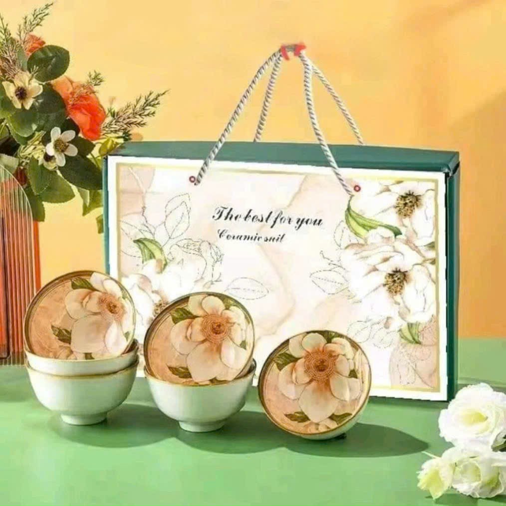 Bộ 6 Bát Đũa Sứ Ăn Cơm Họa Tiết Hoa Trà Kèm Hộp Tặng Quà, Mang Đi Biếu Gia Đình và Bạn Bè