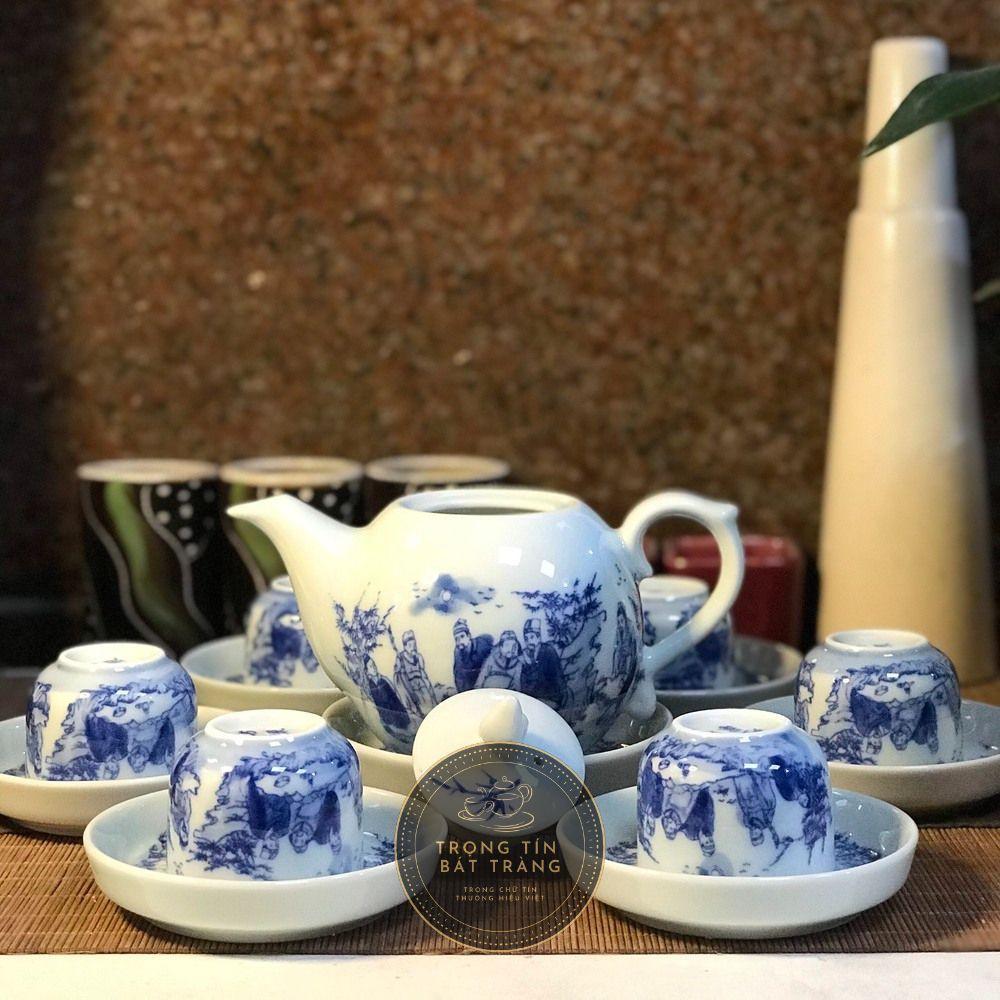 Bộ ấm trà men lam trắng bát tràng được vẽ họa tiết cổ với tích “trúc lâm thất hiền” là một trong những bộ ấm trà thông dụng của làng cổ Bát Tràng. Họa tiết