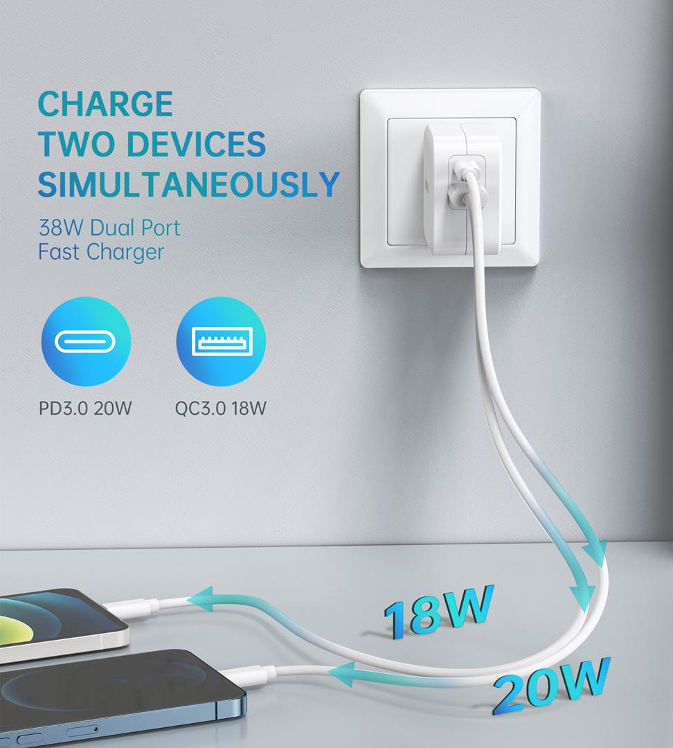 1. Input: 100-240V~50/60Hz 1A Max 2. Output: Single port: 5V/3A 9V/2.22A 12V/1.67A (20W Max) 3. Dual Ports: 5V/3A 9V/2.22A 12V/1.67A (20W*2) 4. Compatible with:PD3.0 (PD2.0) 5. QC4.0+ (QC4.0/QC3.0/QC2.0) SCP/FCP/AFC BC1.2--5V1.5A 6. UL,FCC, PSE,CE Certified