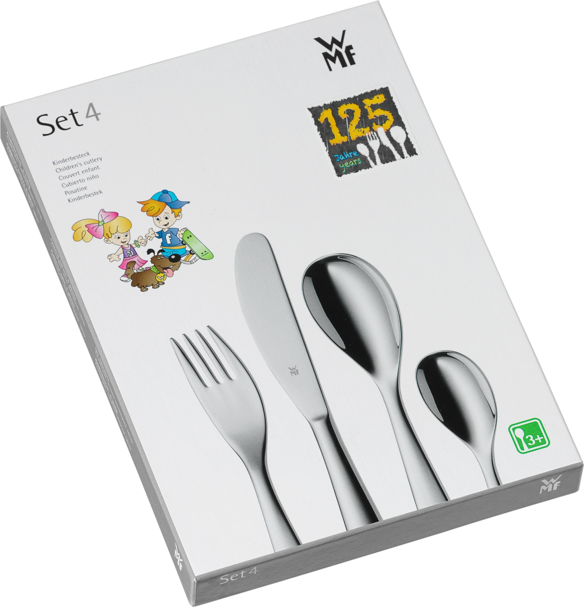 Bộ dao kéo lùn WMF của WMF gồm 4 phần: dao, nĩa, thìa và thìa cà phê.