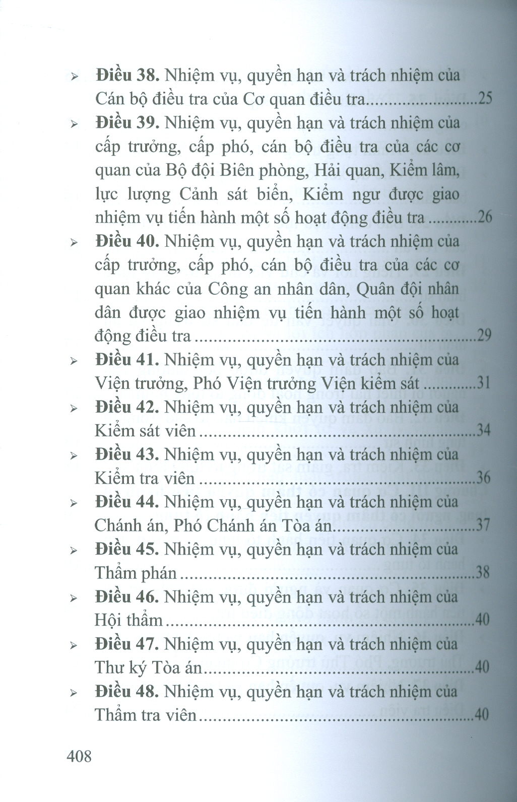 Cuốn sách gồm 9 phần, 510 điều, quy định trình tự, thủ tục tiếp nhận, giải quyết nguồn tin về tội phạm, khởi tố, điều tra, truy tố, xét xử và một số thủ tục