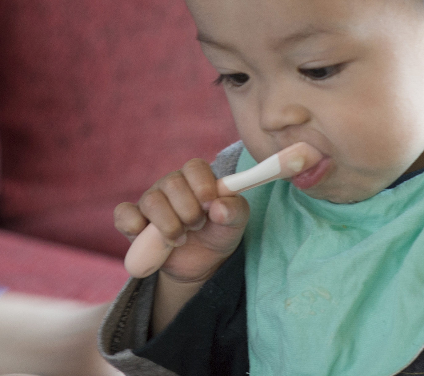 - Cán muỗng-nĩa ngắn, kích thước vừa với lòng bàn tay của bé giúp bé dễ cầm nắm và chắc tay, được bọc 1 lớp TPE cách nhiệt và hạn chế trơn trượt, không bị tuột tay.