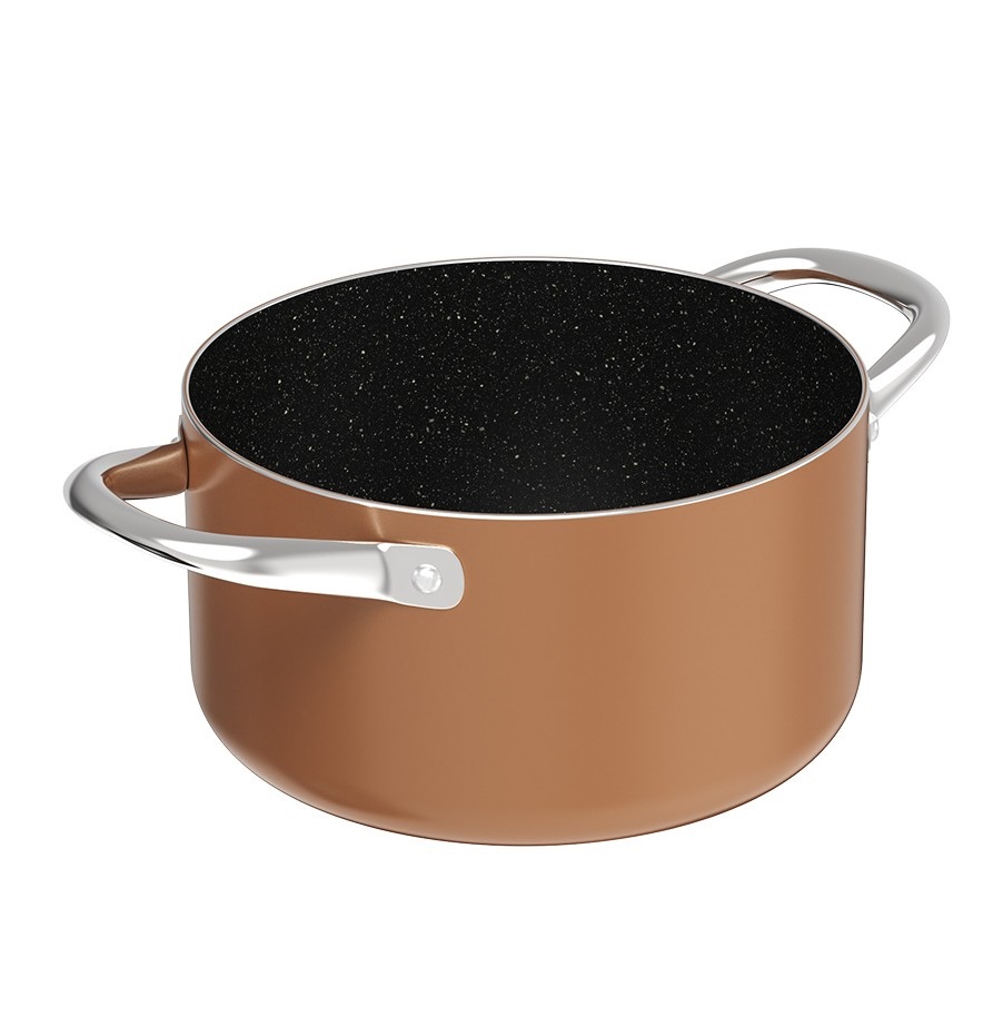 Là bộ nồi cao cấp với màu sắc cực sang, được làm từ chất liệu thân nhôm đúc dày và phủ đá cẩm thạch 3 lớp chống dính. Thân nhôm đúc dày mang lại khả