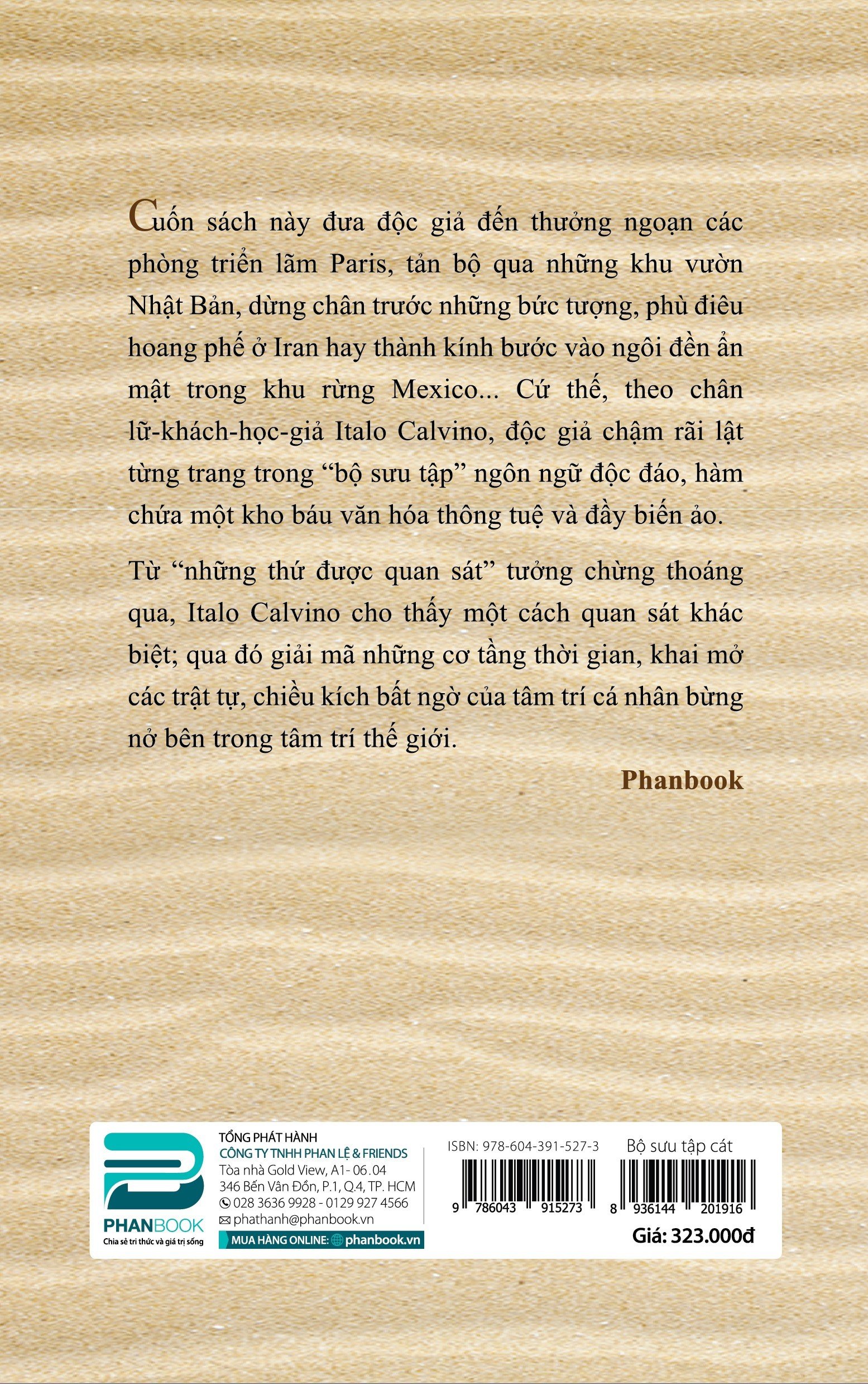 Cuốn sách này đưa độc giả đến thưởng ngoạn các phòng triển lãm Paris, tản bộ qua những khu vườn Nhật Bản, dưng chân trước những bức tượng, phù điêu hoang phế ở Iran hay thành kính bước vào ngôi đền ẩn mật trong khu rừng Mexico... Cứ thế, theo chân lữ-khách-học-giả Italo Calvino, độc giả chậm rãi lật từng trang trong "bộ sưu tập" ngôn ngữ độc đáo, hàm chứa một kho báu văn hóa thông tuệ và đầy biến ảo.
