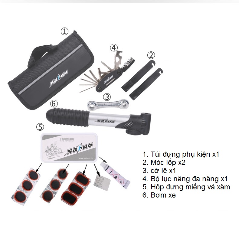 - Hộp sửa chữa lốp ( 1 giải pháp cao su 20cc, 1 miếng chà nhám, 3 miếng vá 50 x 30mm, 3 miếngvá 30mm, 3 miếng vá 25mm)