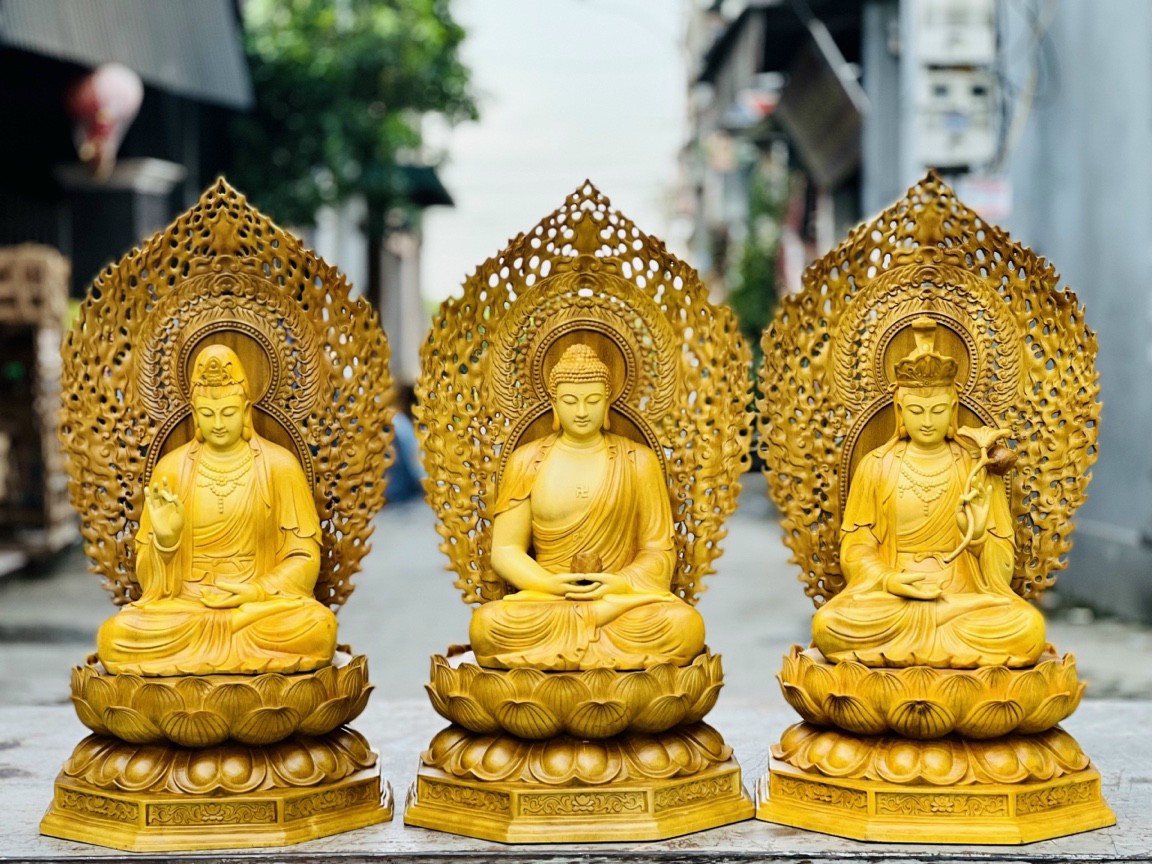 _ Bộ tượng phật tam thánh được trạm khắc vô cùng tỉ mỉ ,tinh sảo tỉ mỉ ,Đi hầu hết tất cả mọi chi tiết góc ngách nội dung hoa văn của tượng đều được gọt tỉa chỉnh sửa hoàn toàn bằng tay thủ công ,Đồng thời bộ tượng được kiểm định kỹ lưỡng ,khắt khe ,như cho vào thẩm sấy cho gỗ khô kiệt .Mục đích trống dập nứt vênh mo mối mọt ,Kết hợp với trà nhám đánh giấy giáp nhiều nước sờ mát lạnh ,Rồi cho vào phun lót làm bóng mờ ,Để giữ lại mầu sắc vân gỗ tự nhiên ,Bộ tượng được làm và hoàn thiện ,do bàn tay khối óc tài hoa ,Từ những người thợ dầy rặn kinh nghiệm ,Cũng như tay nghề cao trong làng nghề truyền thống .Chính vì thế bộ tương tây phương tam thánh đã đáp ứng đầy đủ những tiêu trí ( Đẹp bền rẻ ) Thẩm mỹ nghệ thuật với chất lượng tuyệt vời