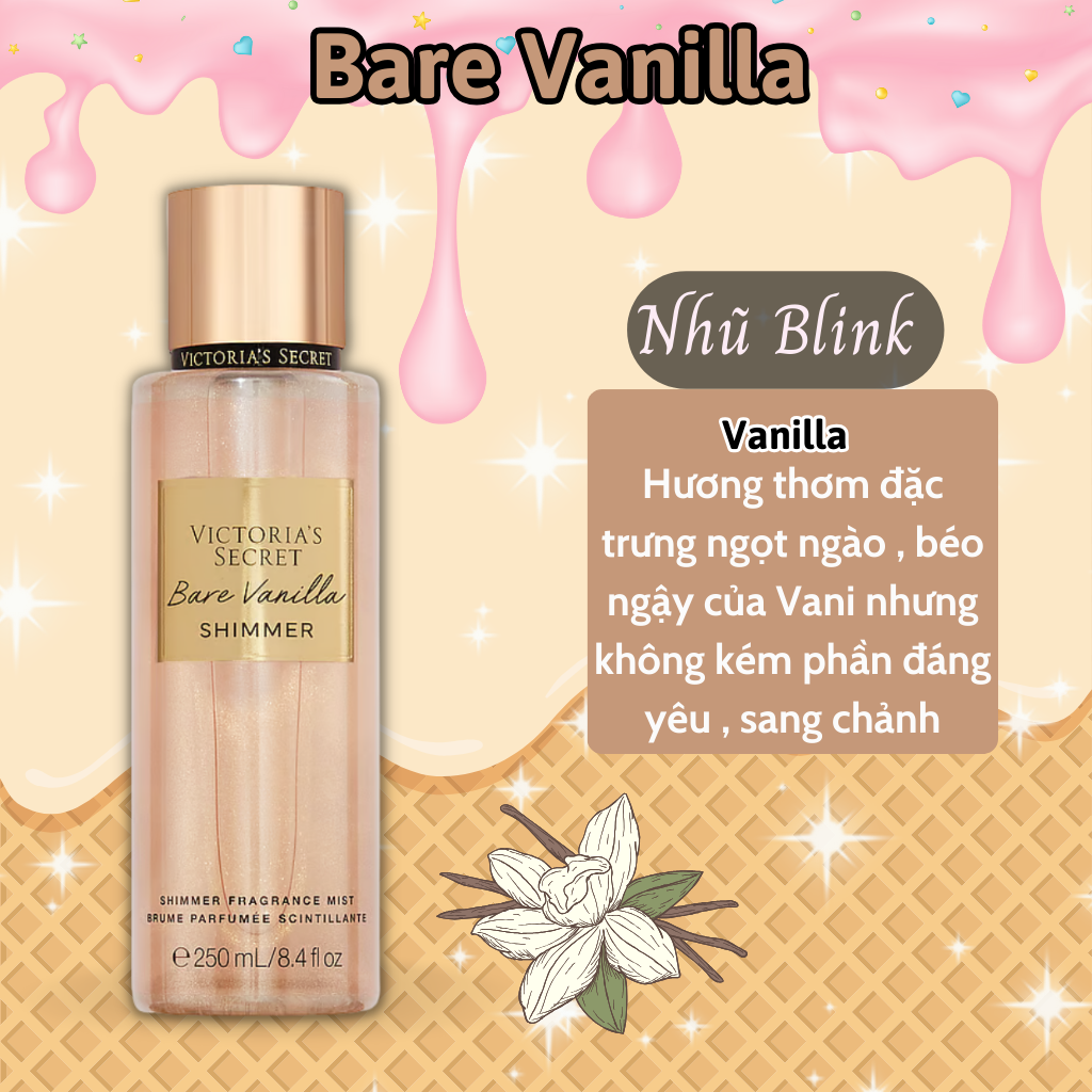 Body Mist Victoria Secret Chính Hãng Bare Vanilla Shimmer, Xịt Thơm Body Toàn Thân Hương Nước Hoa 250ml