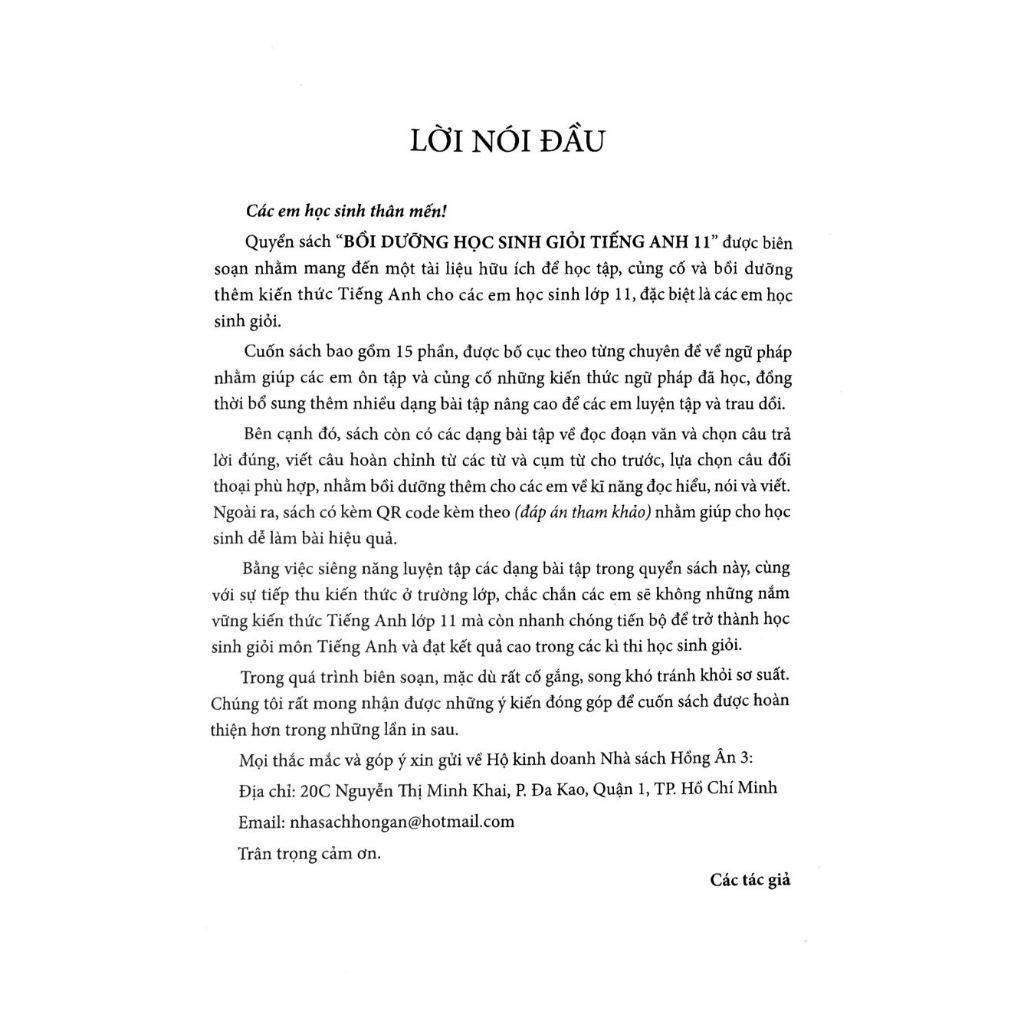 Quyển sách “BỒI DƯỠNG HỌC SINH GIỎI TIẾNG ANH 11" được biên soạn nhằm mang đến một tài liệu hữu ích để học tập, củng cố và bồi dưỡng thêm kiến thức Tiếng Anh cho các em học sinh lớp 11, đặc biệt là các em học sinh giỏi.