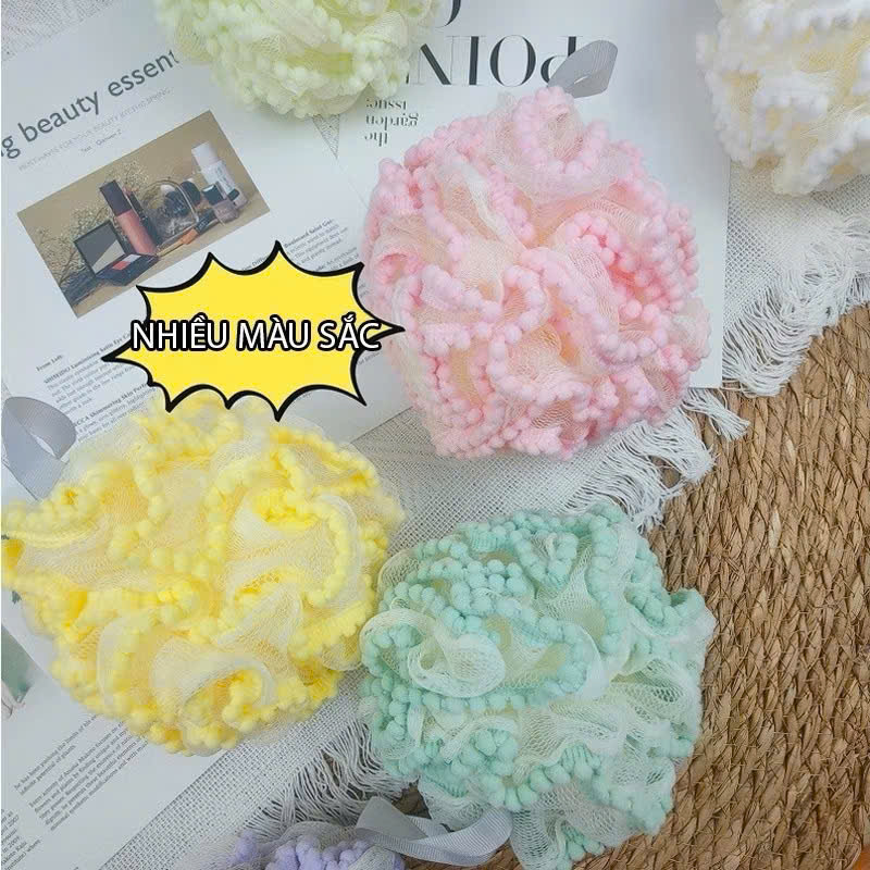 Nhiều Màu Sắc Tươi Sáng: Bông tắm có các màu sắc đẹp mắt như Hồng, Xanh, Tím, Trắng, mang lại sự tươi mới và dễ dàng lựa chọn theo sở thích cá nhân.