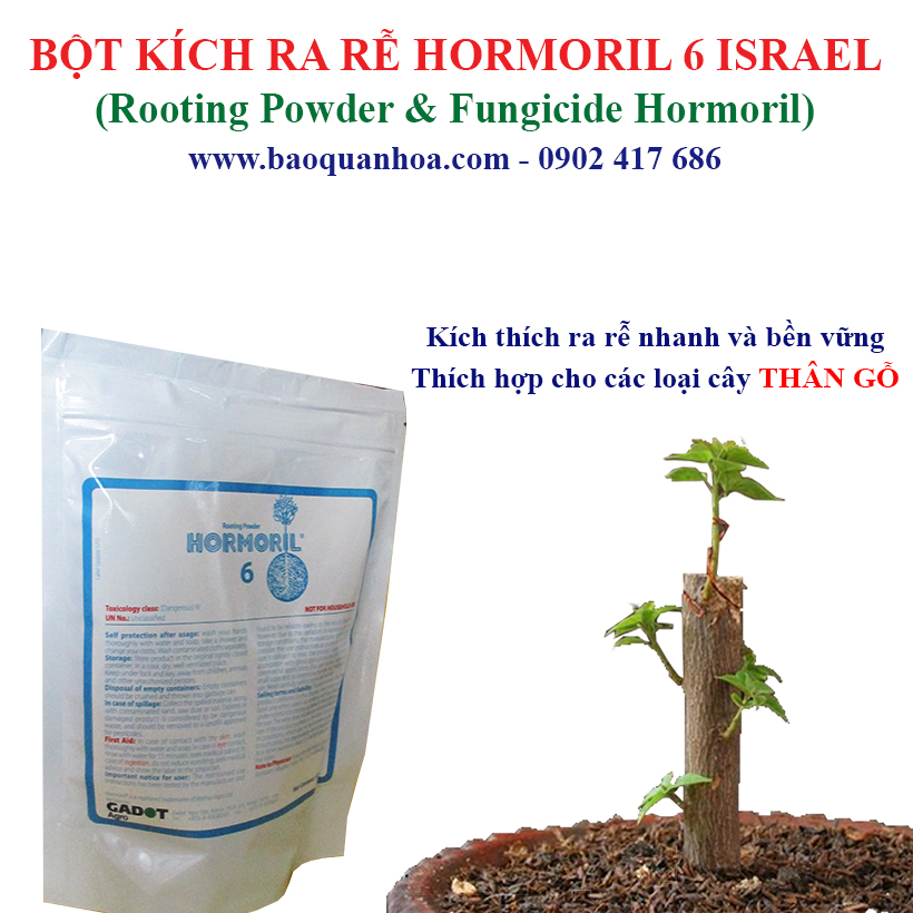 BỘT KÍCH RỄ ISRAEL DÀNH CHO CÂY THÂN GỖ –  HORMORIL T6 – Nhập khẩu: Israel  – Chức năng: dùng kích thích ra rễ, giúp rễ cây phát triển nhanh và an toàn 90%. Đặc