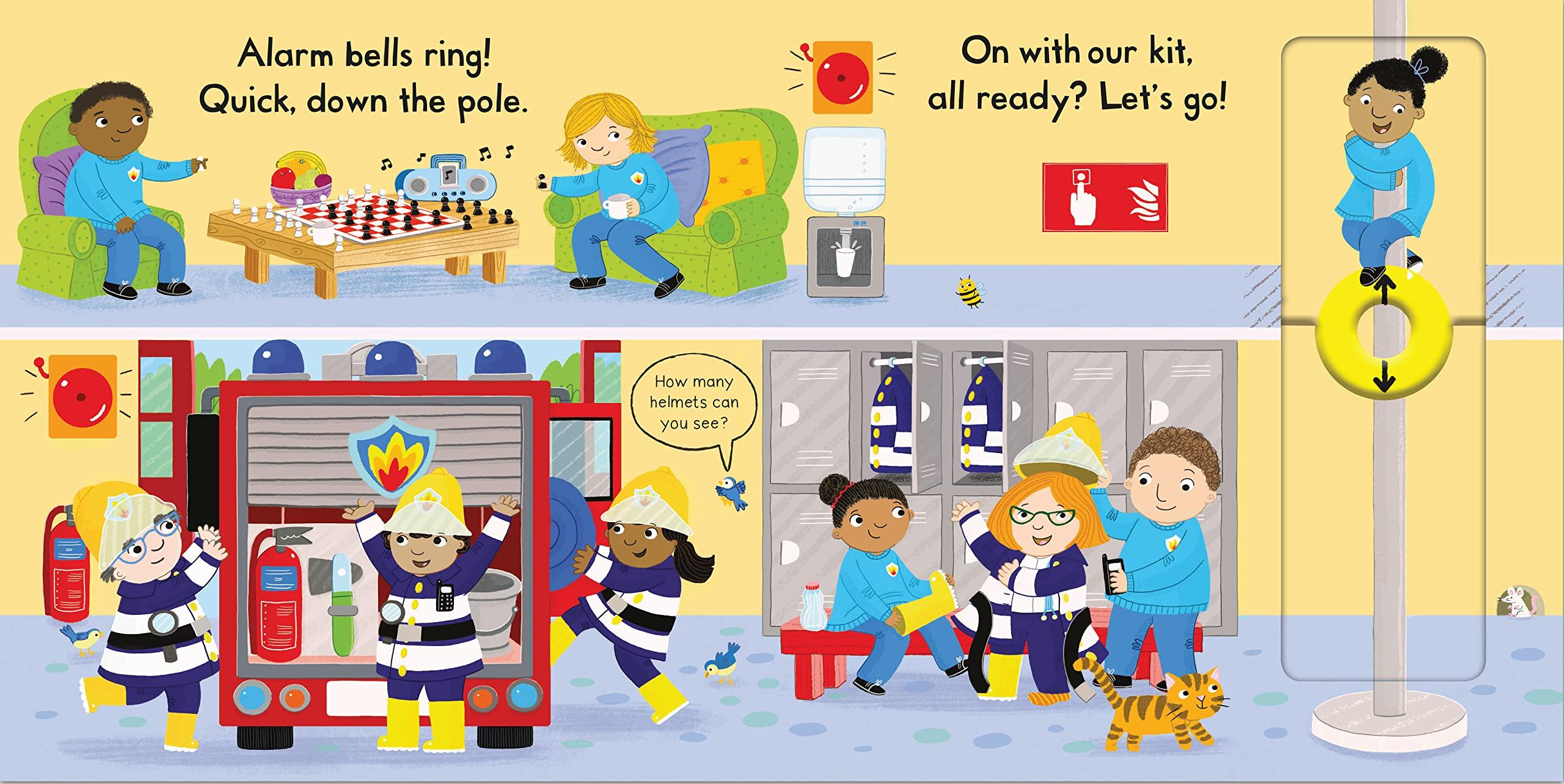 Push, pull and slide the tabs to be a part of the Busy Fire Station! Join in with the firefighters as they slide down the pole, drive the fire engine and put out a fire while everyone cheers.