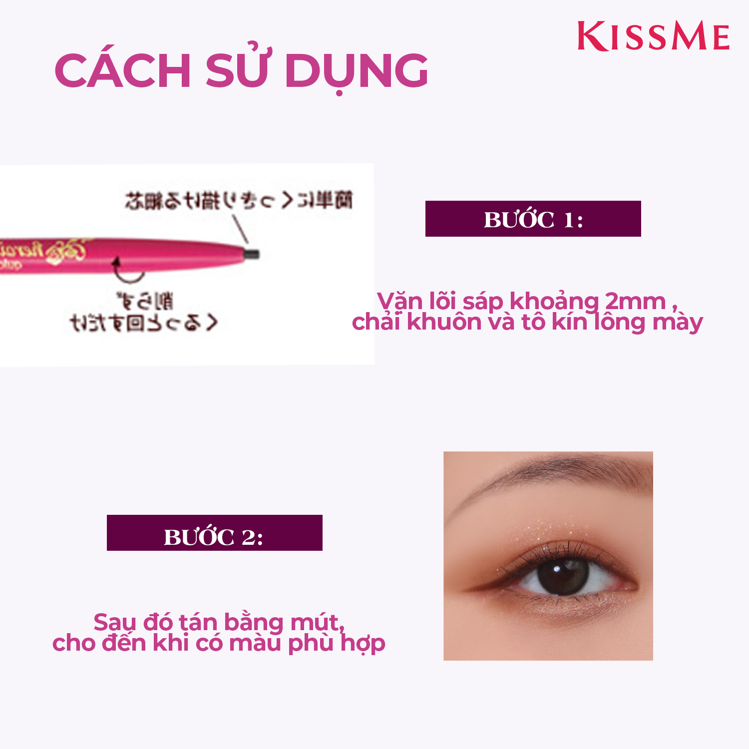 Số Lô: In trên sản phẩm Thương hiệu: Kissme Xuất Xứ: Nhật Bản Khối lượng tịnh: 0.1g HSD: 5 năm kể từ ngày sản xuất Chì kẻ mí mắt, đẹp bền , không trôi , thiết kế 2 đầu ,1 đầu là lõi chì mịn dễ vẽ chống cọ sát da, đầu còn lại là đầu mút tán màu, mịn giúp nét kẻ luôn tự nhiên . Phù hợp cho người mới biết trang điềm hoặc thích tone màu tự nhiên 1/ Công dụng :