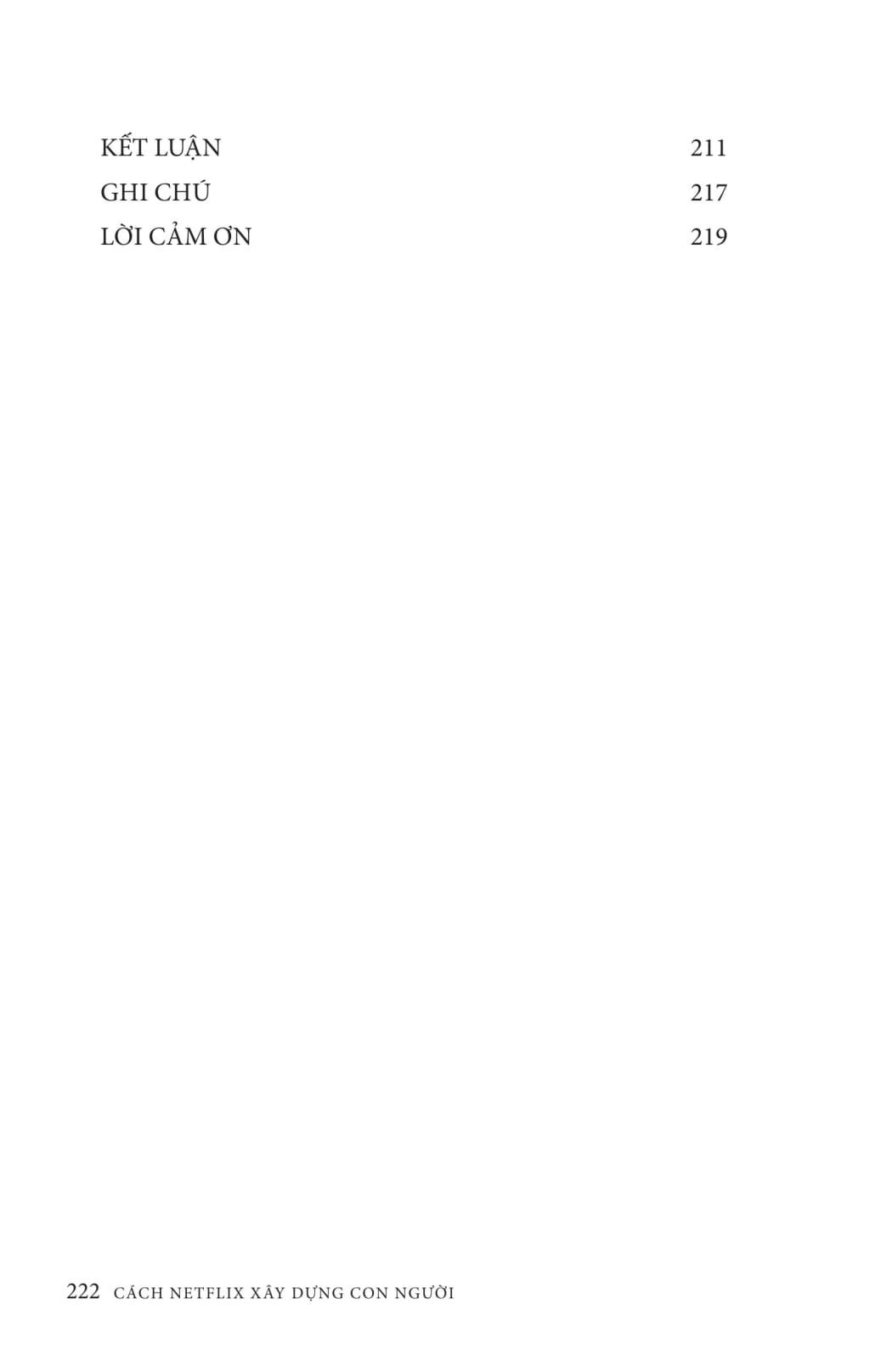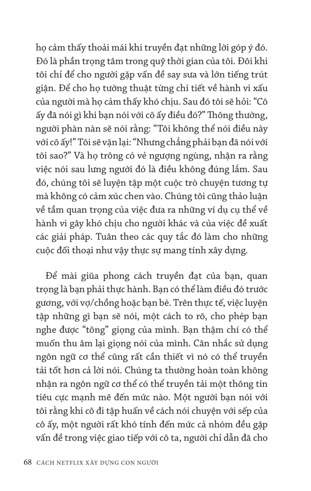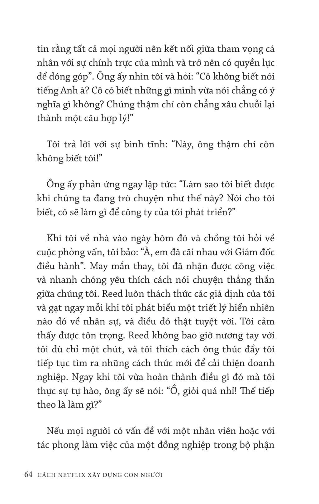 ộc giả sẽ cùng tìm hiểu xem làm thế nào để đề cao tính trung thực triệt để trong môi trường công sở, thúc đẩy sự tranh luận sôi nổi của mọi người và hướng tất cả liên tục tập trung vào tương lai ra sao để đưa doanh nghiệp đi tới thành công. Không chỉ là tìm người phù hợp với từng vị trí, các vấn đề nhạy cảm như lương thưởng cũng như cho thôi việc, chuyển việc cũng được xem xét tới. Đây là một cuốn sách đáng đọc cho những người muốn tìm hiểu về thành công của Netflix cũng như muốn xây dựng được một văn hóa doanh nghiệp phù hợp với tầm nhìn của mình.
