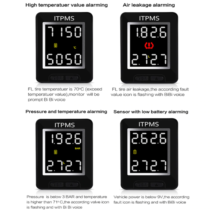 - Hiển thị Bốn bánh xe, áp suất lốp, nhiệt độ lốp, điện áp ắc quy có thể được theo dõi trong thời gian thực