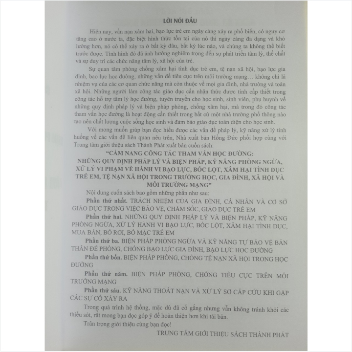 Nhà sách Nam Việt – Namvietbook xin trân trọng giới thiệu sách CẨM NANG CÔNG TÁC THAM VẤN HỌC ĐƯỜNG NHỮNG QUY ĐỊNH PHÁP LÝ VÀ BIỆN PHÁP, KỸ NĂNG PHÒNG NGỪA, XỬ LÝ VI PHẠM VỀ HÀNH VI BẠO LỰC, BÓC LỘT, XÂM HẠI TÌNH DỤC TRẺ EM, TỆ NẠN XÃ HỘI TRONG TRƯỜNG HỌC, GIA ĐÌNH, XÃ HỘI VÀ MÔI TRƯỜNG MẠNG