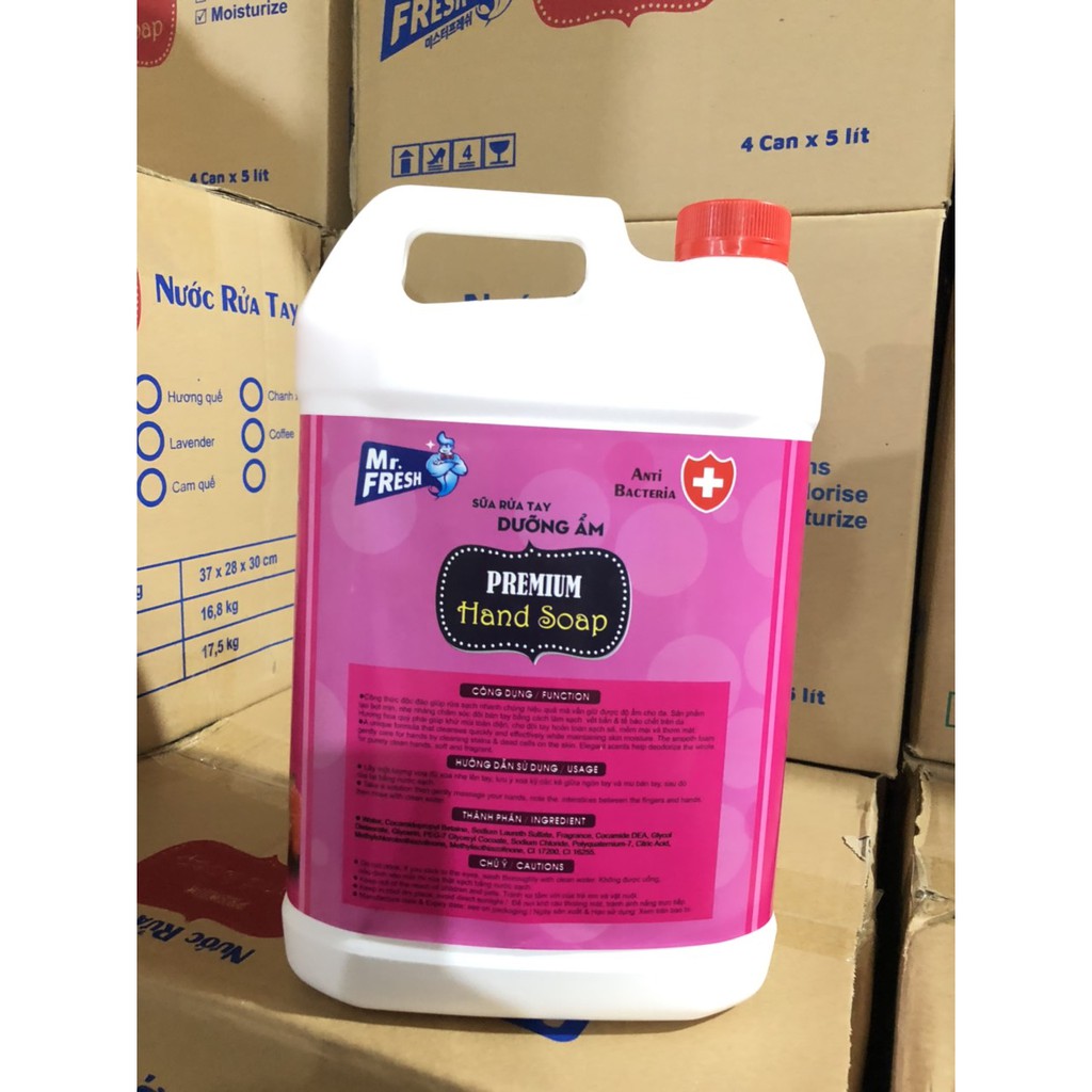 THÔNG TIN SẢN PHẨM Tên sản phẩm : Nước rửa tay Premium Hand Soap Mr Fresh 5l Công dụng : Làm sạch tay, kháng khuẩn, khử mùi, giúp đôi tay mềm mại mà vẫn sạch