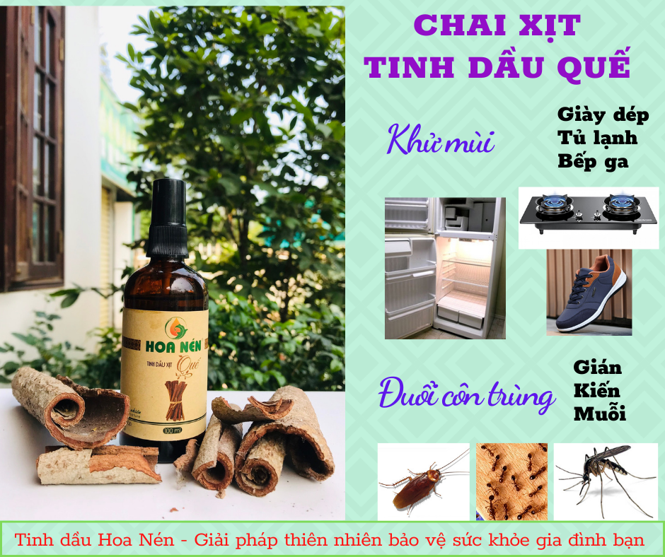 Tinh dầu thiên nhiên ngày càng trở thành sự lựa chọn ưu tiên với nhiều người, được chiết xuất từ thân và lá cây có hoạt tính sinh học c.hống lại vật là chất đ.ề k.háng của cây nên có mùi hương tự nhiên, tính s.át ẩn mạnh, xua đuổi muỗi, côn trùng tấn cô Với những tính chất đặc biệt như vậy, HOA NÉN đã cho ra sản phẩm “Tinh dầu xịt” phòng, xe ô tô, giày, mũ bảo hiể với nhiều loại tinh dầu thiên nhiên khác nhau, mỗi loại đều có mỗi công dụng riêng, an toàn và thân thiện với môi trường. THÀNH PHẦN: Tinh dầu nguyên chất, nước cất tinh dầu, ethanol thực phẩm. CÔNG DỤNG: