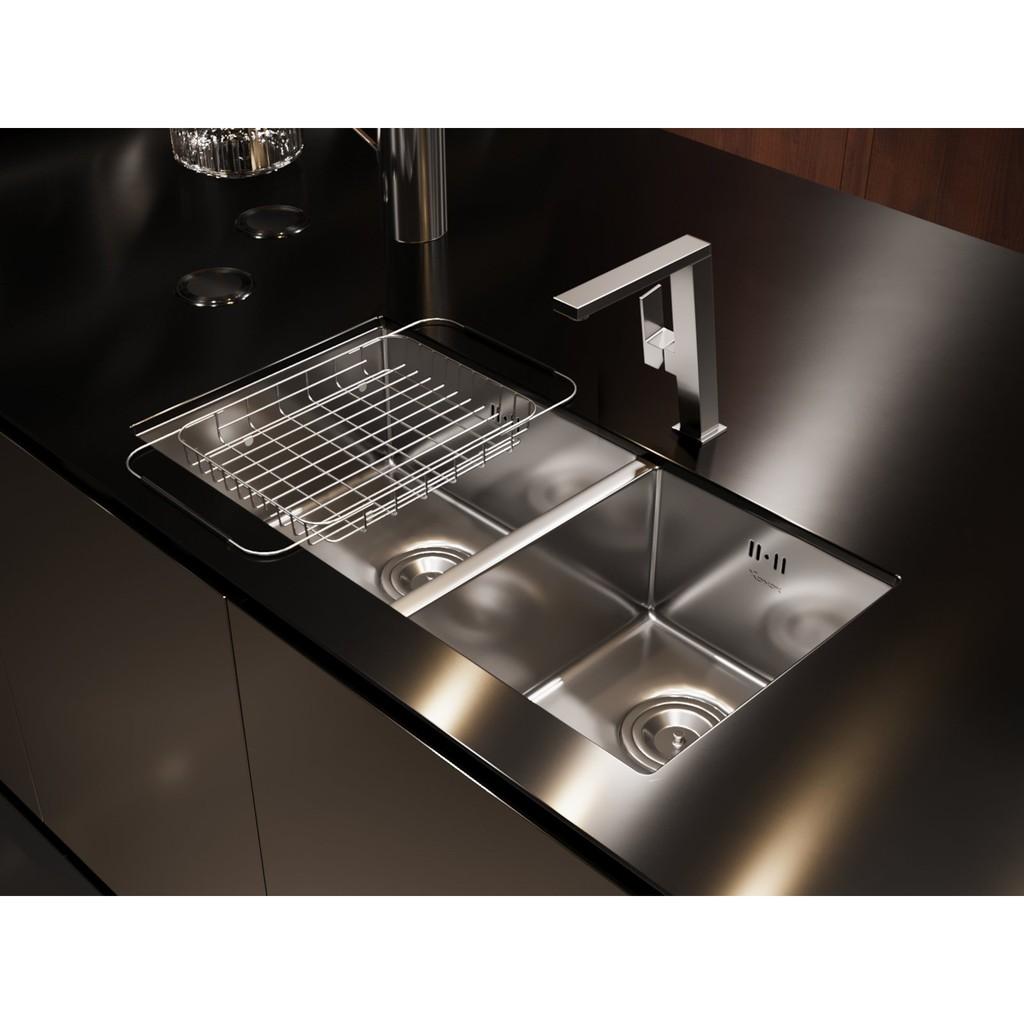 Mã sản phẩm: Cube 7544DU Kích thước (mm): 750440220 Kích thước hố (mm): 340400; 340400 Cắt đá (mm): 710*400 (Cắt đá lắp âm) Độ dày (mm): 1.0 Chất liệu: SS304 Full set kèm Siphon, giá úp bát inox