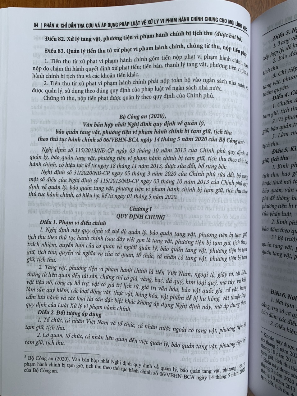 Để tiện tra cứu và áp dụng pháp luật về xử lý vi phạm hành chính, nhóm tác giả đã biên soạn bộ sách “Chỉ dẫn tra cứu và áp dụng pháp luật về xử lý vi phạm hành chính (được sửa đổi, bổ sung năm 2020)”, ngoài lời giới thiệu, danh mục văn bản chỉ dẫn tra cứu và áp dụng pháp luật về xử lý vi phạm hành chính, bộ sách gồm 02 phần và được chia làm 02 quyển: