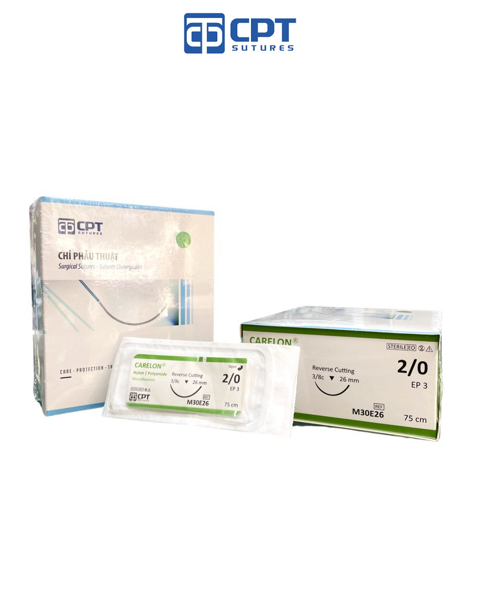 Chỉ phẫu thuật không tiêu Carelon Nylon: 2/0 USP, dài 75 cm, kim tam giác 3/8c, dài 26 mm, mã hàng: M30E26. Quy cách đóng gói: 24 tép. THÀNH PHẦN: Carelon là chỉ phẫu