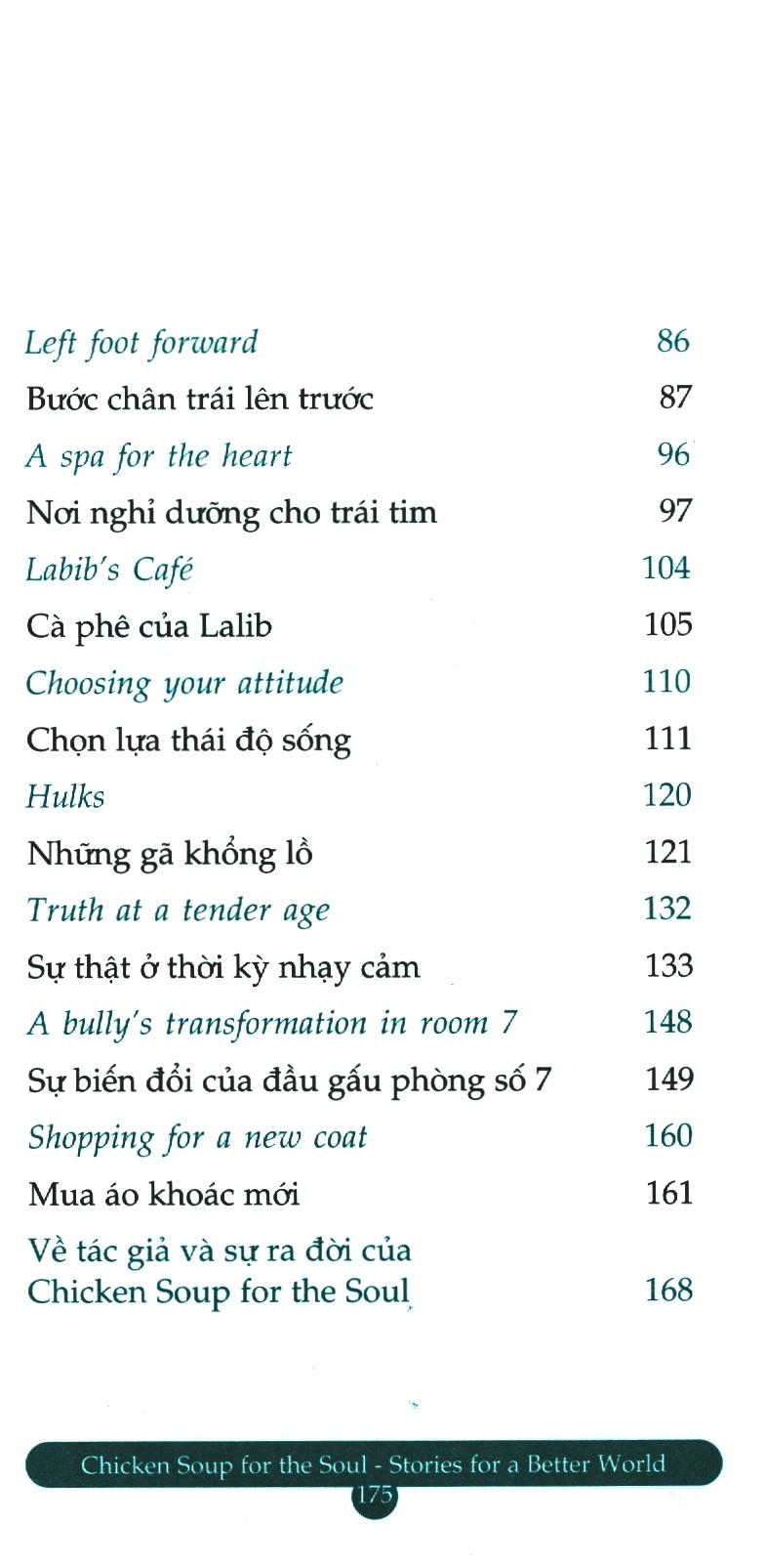 Mong rằng bạn sẽ dành ra chút thời gian nghĩ lại về những câu chuyện đã tác động tích cực đến bạn – dù bạn đọc trong sách của chúng tôi hay trong những cuốn sách khác, hay chính bạn gặp phải trong cuộc sống – và hồi tưởng lại cảm giác phấn khích tuyệt vời bạn đã có khi lần đầu tiên cảm nhận. Những câu chuyện trong Chicken Soup for the Soul Stories for a Better World – Tin vào ngày mai truyền cảm hứng và chia sẻ niềm vui trong cuộc sống, về niềm tin vào những điều tốt đẹp, bất kể những khó khăn trước mắt.